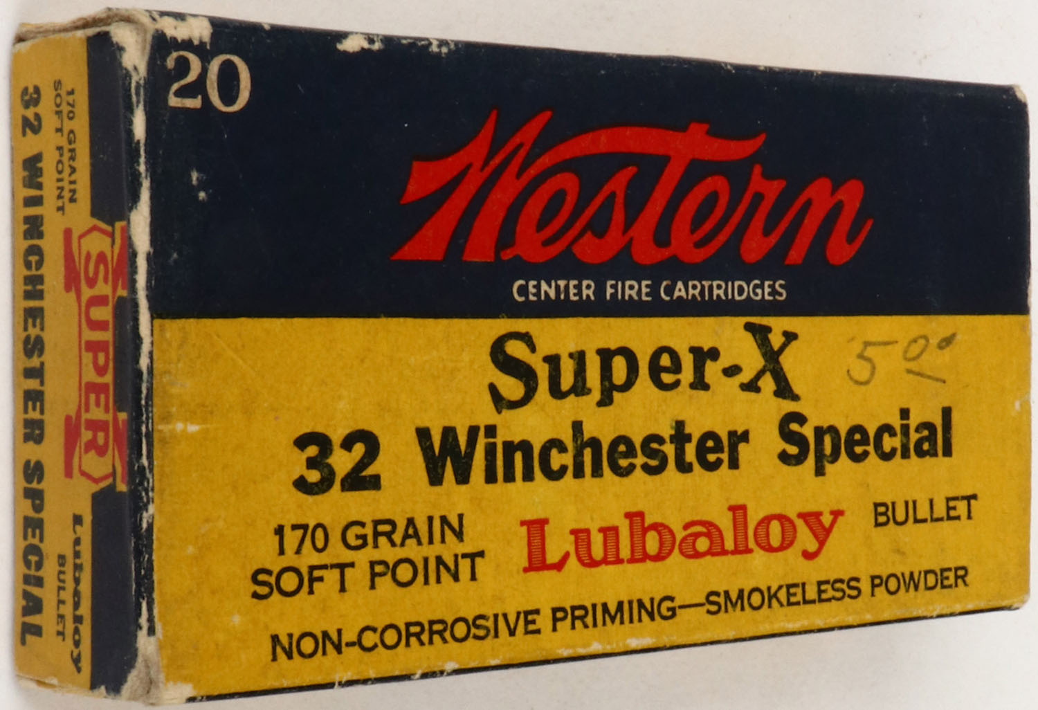 Western, Super-X, .32 Winchester Special, 170 Grain Lubaloy Bullet, Full, 1pc. Yellow blue & red box, box is missing right end flap, box has excellent color, minor age soiling, some edge & corner wear, top has been written on, ammo is excellent. (185) Grade: Very Good - Value: 30 to 60