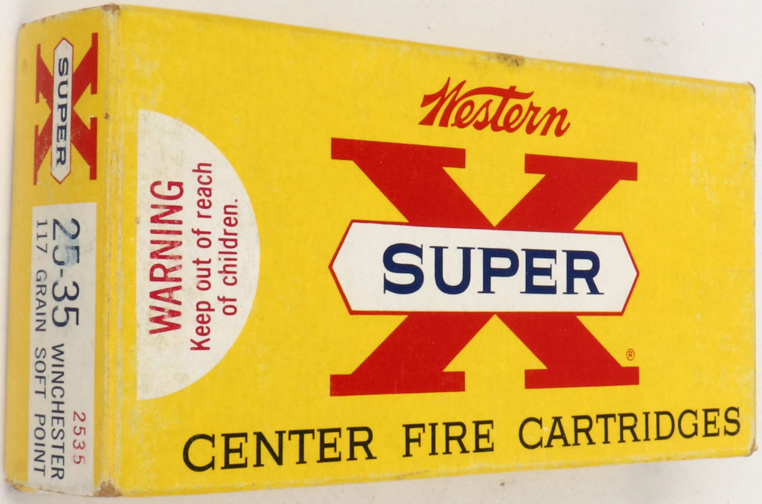 Western, Super X, .25-35 Winchester, 117 Gr. Soft Point, Full, 1pc. Yellow white & red box, box is solid with excellent to minty color, very minor corner wear, edges are mostly crisp, end flaps are solid, ammo is excellent. Grade: Excellent - Value: 20 to 60