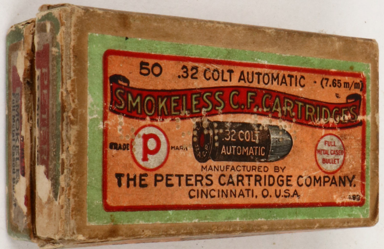 Peters, .32 Colt Automatic (7.65 m/m), Full Metal Cased Bullet, Full, 2pc. Buff box with salmon top & side sealing labels, box is solid with very good color, age soiling, edge & corner wear, 2 seam splits to left corners of lid, left end of lid is glued to box, ammo is excellent. Grade: Very Good - Value: 40 to 120