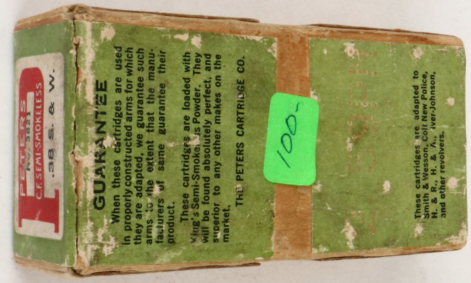 Peters, .38 S&W, Semi-Smokeless Powder, Full, 2pc. Buff box with white red & green wraparound label, box is solid with very good to excellent color, minor age soiling, very minor shelf & corner wear, staining to top, sticker on bottom, label is intact, ammo is very good. Grade: Excellent - Value: 30 to 120