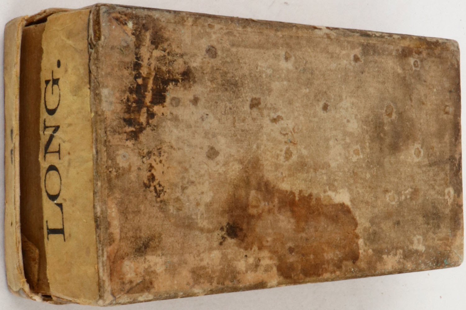 U.S. Cart. Co., Metallic Cartridges, .44 Long, (Rim Fire), Target Cartridges, Full, 2pc. Buff box with gray top & orange side sealing label, has partially torn insert, box is solid with good color, age soiling, shelf wear, edge & corner wear, two seam splits on right end of lid, back has been written on, labels are 95% intact, ammo is good. Grade: Good ++ - Value: 50 to 150