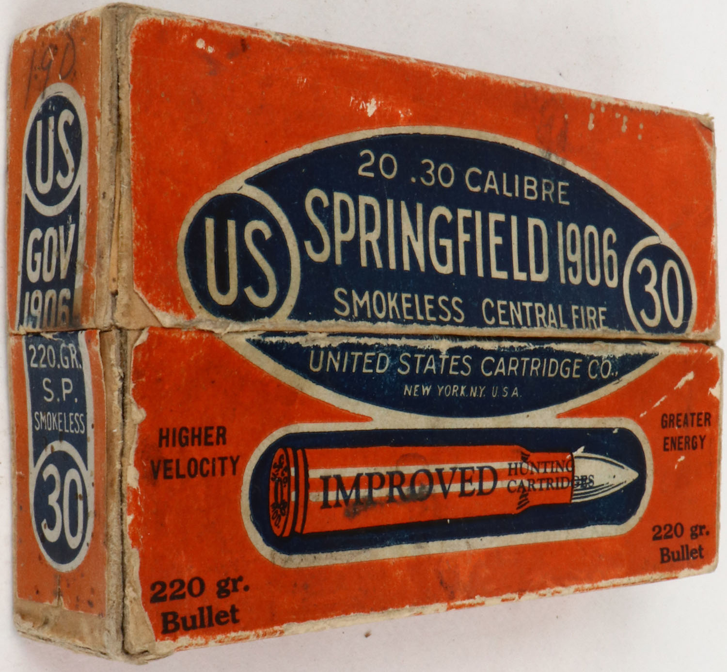 U.S. Cart. Co., .30 Springfield 1906 (.30-06), 220 Gr. Bullet, Partial 18rds. 2pc. Orange blue & white box, box is solid with excellent color, minor age soiling, edge & corner wear, partial seam split to front left edge, labels are intact, left end of lid has been written on, ammo is excellent. Grade: Very Good + - Value: 30 to 60