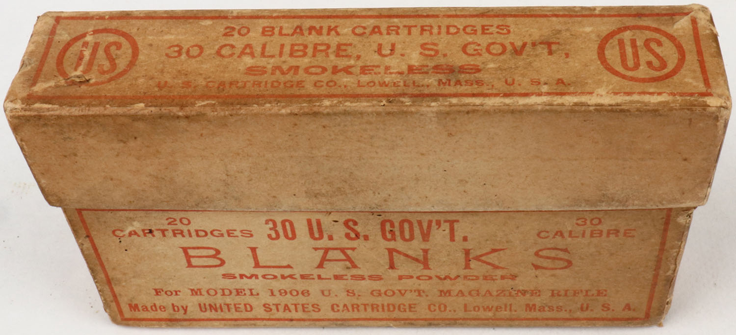 U.S. Cart. Co., .30 U.S. Gov't Blanks, Smokeless Powder, FULL & SEALED, 2pc. Buff box with buff & red labels, box is solid with very good color, age soiling, some edge & corner wear, labels are intact. Grade: Very Good ++ - Value: 20 to 80