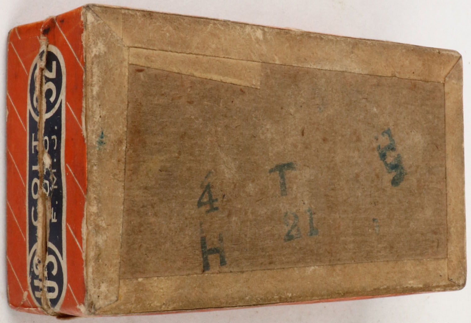 U.S. Cart. Co., .32 Colt Automatic, Smokeless, Full Metal Jacket, Full, 2pc. Orange blue & white box, box is solid with excellent color, some age soiling, minor edge & corner wear, top has been written on, some shelf wear, ammo is excellent. Grade: Very Good ++ - Value: 20 to 60