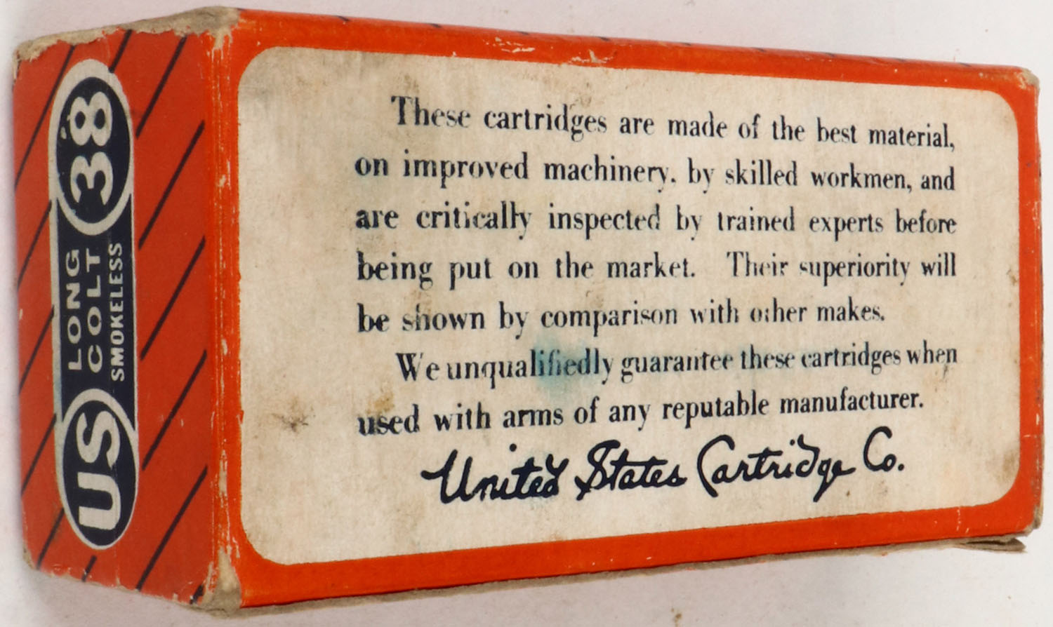 U.S. Cart. Co., .38 Long Colt, Smokeless, Full, 1pc. Orange blue & white box, box is solid with excellent to minty color, corner wear, small tear to top, very minor scuffing on bottom, edges are mostly crisp, end flaps are solid, ammo is excellent. Grade: Very Good ++ - Value: 30 to 90