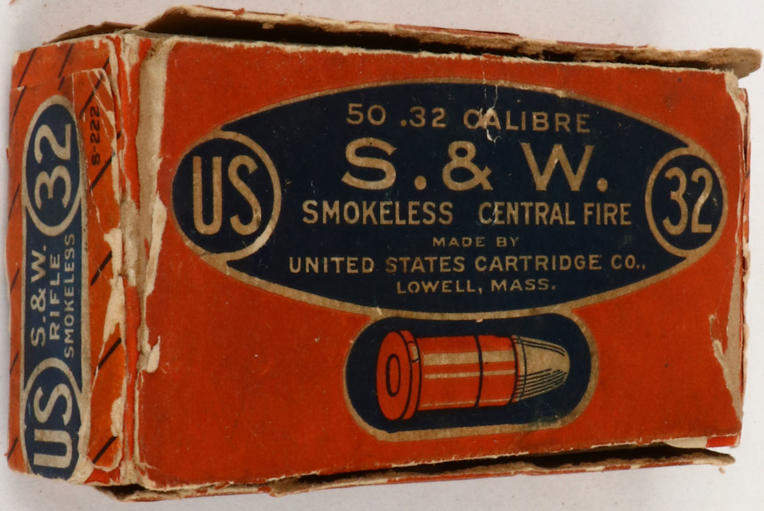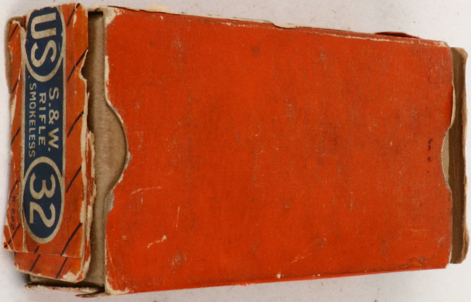 U.S. Cart. Co., .32 S&W, Smokeless, Full, 1pc. Orange & blue box, box is torn along both seams, and the structure of the box is no long intact. Ammo is very good to excellent. Grade: Fair + - Value: 6 to 30