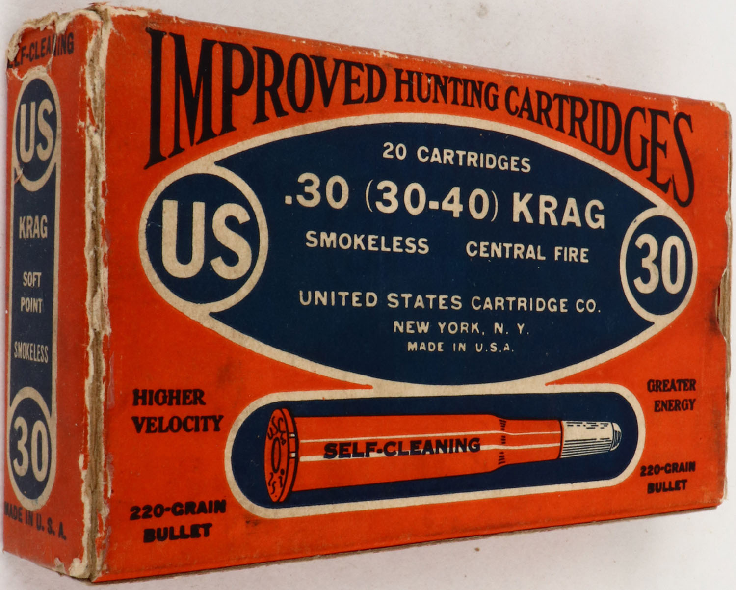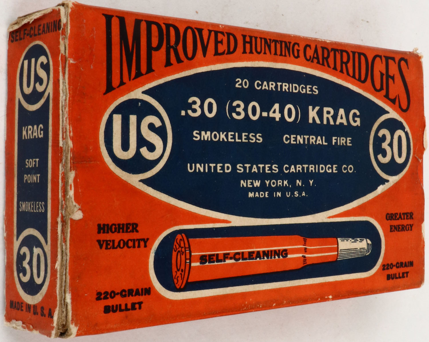 U.S. Cart. Co., Improved Hunting Cartridges, .30 (.30-40) Krag, 220 Grain Bullet, Partial 19rds., 1pc. Orange blue & white box, box is solid with excellent color, minor age soiling, some edge & corner wear, left end flap is torn, ammo is very good. Grade: Very Good + - Value: 20 to 60