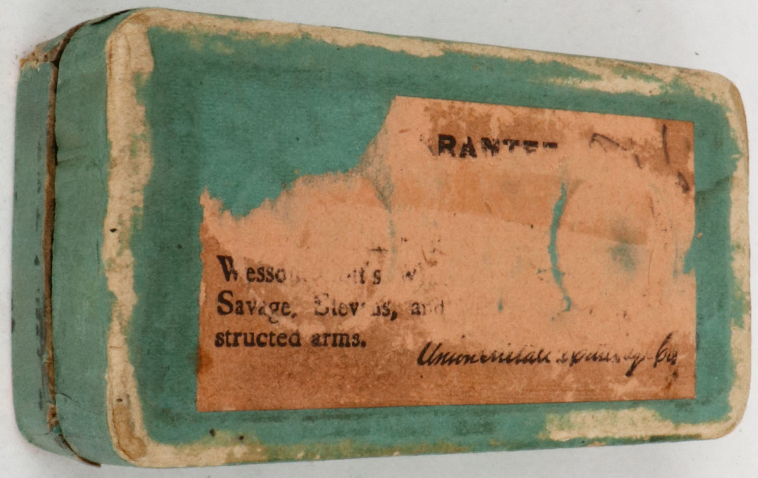 UMC, .32 S&W, 88 Grs. Bullet, Full, 2pc. Blue box with blue top label, box is solid with very good color, age soiling, edge & corner wear, side sealing label is mostly gone, shelf wear, ammo is very good. (976) Grade: Good ++ - Value: 10 to 60