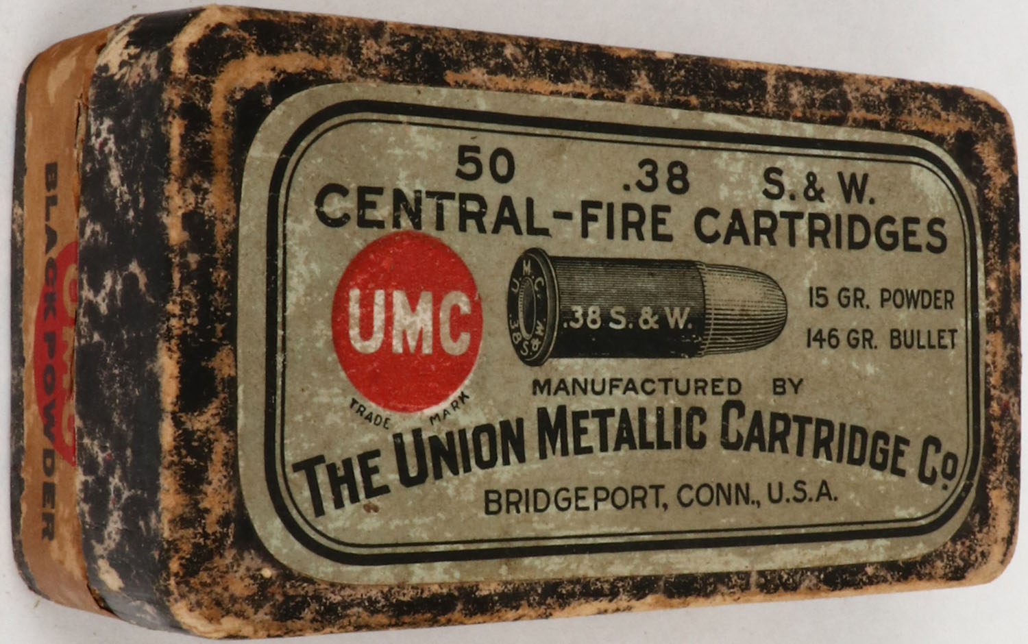 UMC, .38 S&W, 15 Gr. Powder, 146 Gr, Bullet, Partial 42rds., 2pc. Black mottled box with gray top & buff side sealing labels, box is solid with excellent color, very minor age soiling, edge & corner wear, side sealing label is 60% intact, ammo is excellent. (608) Grade: Very Good ++ - Value: 10 to 50