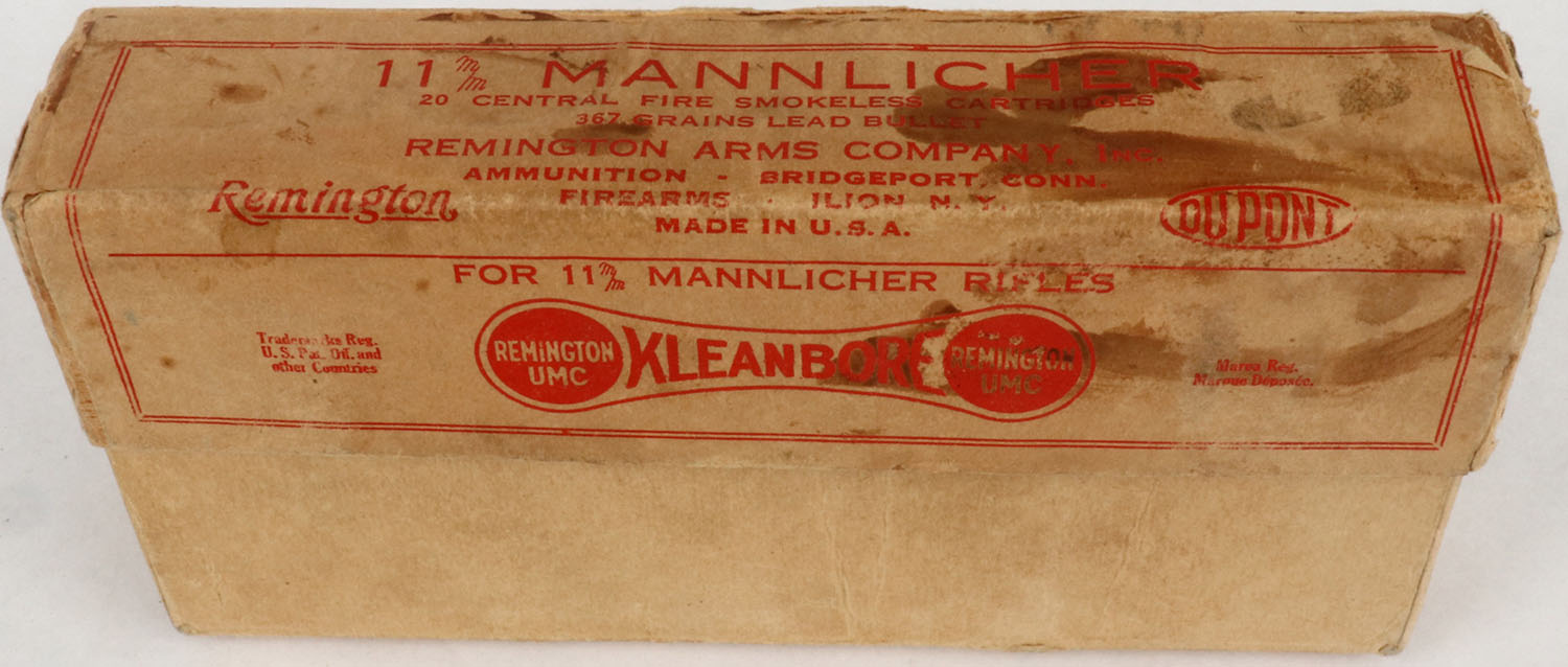 REM-UMC, 11mm Mannlicher, 367 Grains Lead Bullet, Full, 2pc. Buff box with buff & red label, box is solid with excellent color, very minor age soiling, some staining to lid, some edge & corner wear, label is intact, ammo is very good to excellent. (100) Grade: Very Good ++ - Value: 20 to 60