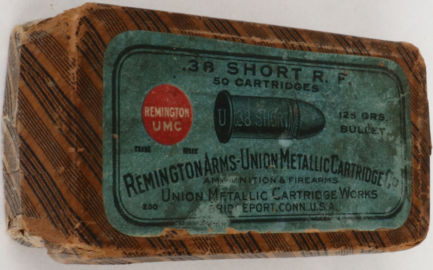 REM-UMC, .38 Short Rim Fire, 125 Grs. Bullet, Full, 2pc. Fabric box with blue top label, box is solid with very good color, age soiling, corner wear, minor edge wear, vertical seam splits to all corners of lid, right end has been written on, ammo is good to very good. Grade: Good + - Value: 20 to 80