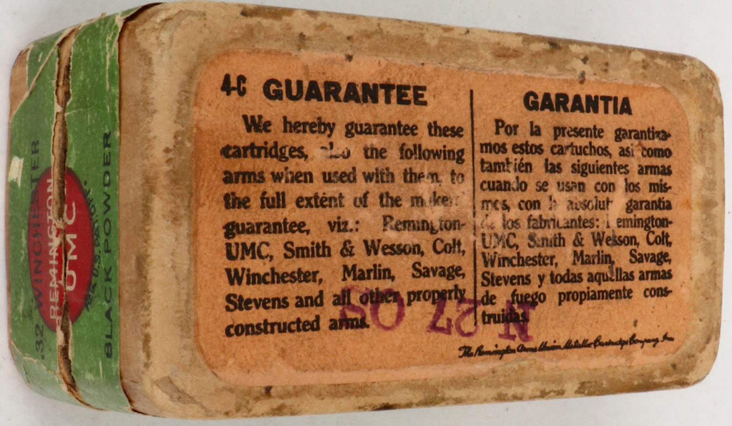 REM-UMC, .32 Winchester, Black Powder, 100 Grs. Bullet, Full, 2pc. Buff box with green top & side sealing labels, box is solid with excellent color, age soiling, some edge & corner wear, minor shelf wear, side sealing label is 90% intact, ammo is good to very good. Grade: Very Good - Value: 20 to 100