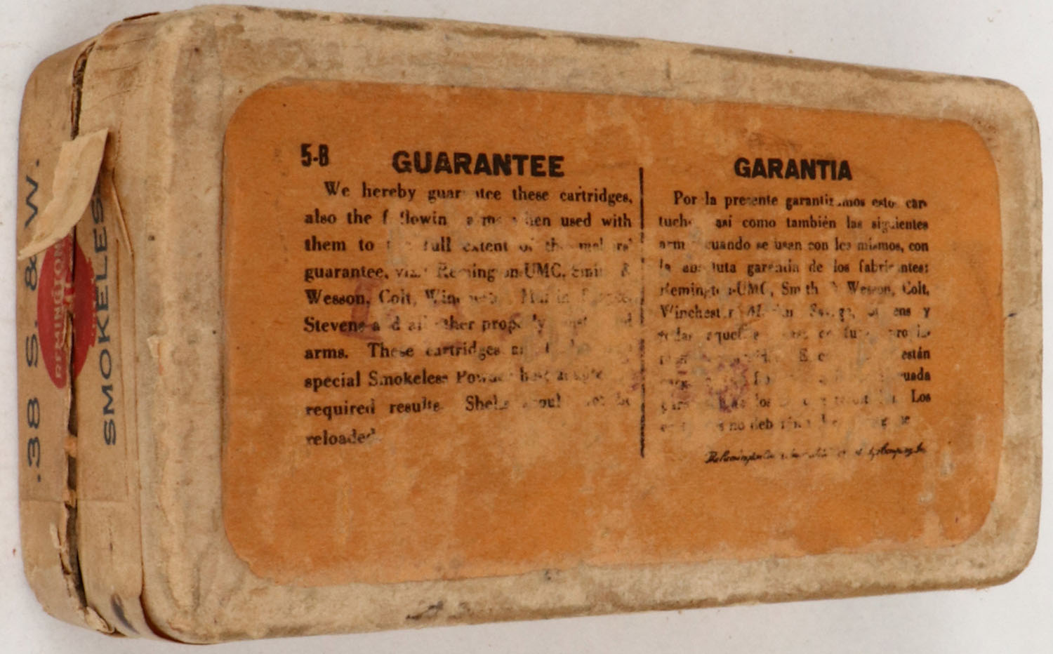 REM-UMC, .38 S. & W. Smokeless, Central Fire Cartridges, 146 Grs. Bullet, 2pc, Full, buff box/label & black/red print, box is solid with excellent color, parts of left end & side labels missing, very minor edge wear & light corner wear, ammo is excellent. (138) Grade: Very Good + - Value: 30 to 90