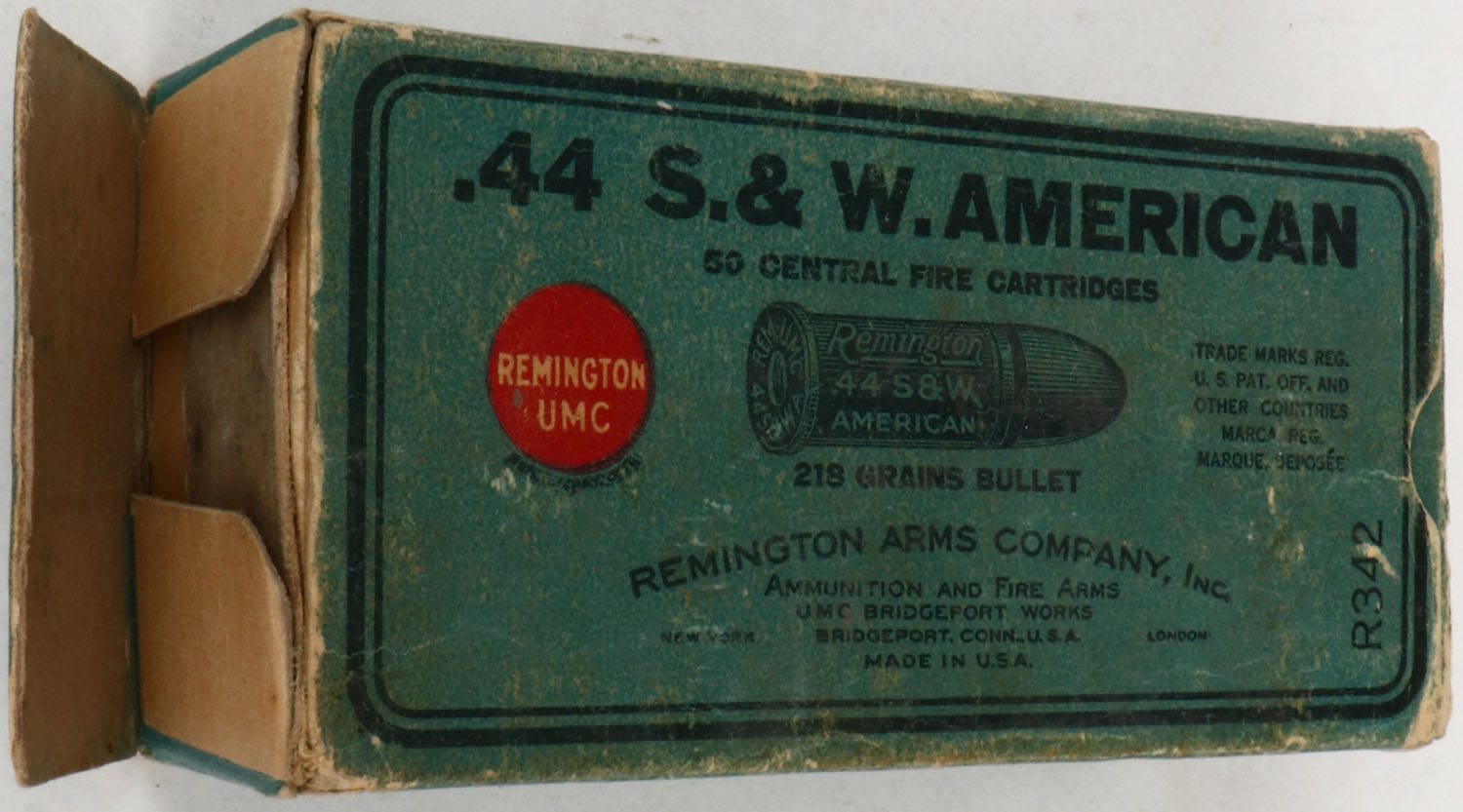 REM-UMC, .44 S&W American, 218 Grains Bullet, Full, 1pc. Blue black & red box, box is solid with very good color, age soiling, insert tab of left end flap is torn, some edge & corner wear, minor shelf wear, ammo is good. Grade: Very Good - Value: 20 to 100