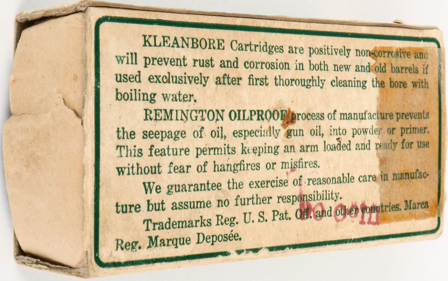 Remington, Kleanbore, .45 Auto Rim, 230 Grains Lead Bullet, Partial 48rds., 1pc. Green white & red dog bone box, box is missing both end flaps, has excellent color with only very minor age soiling, some staining to left end, very minor shelf & corner wear, ammo is excellent. Grade : Very Good - Value: 20 to 80