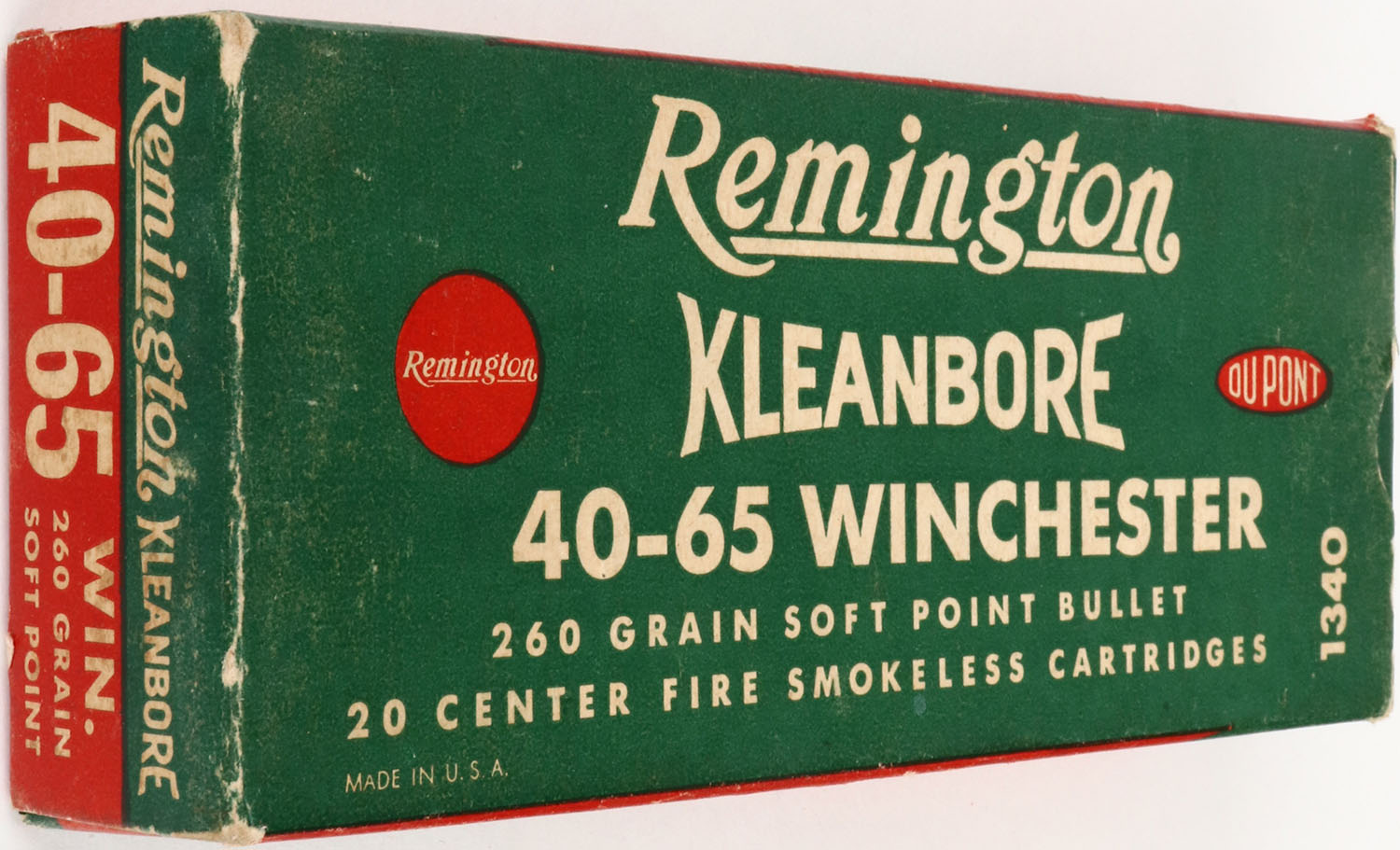 Remington, Kleanbore, .40-65 Winchester, 260 Grain Soft Point Bullet, Partial 10rds., 1pc. Green red & white box, box is solid with excellent color, very minor age soiling & corner wear, edges are mostly crisp, end flaps are solid, ammo is excellent. Grade: Excellent - Value: 10 to 100