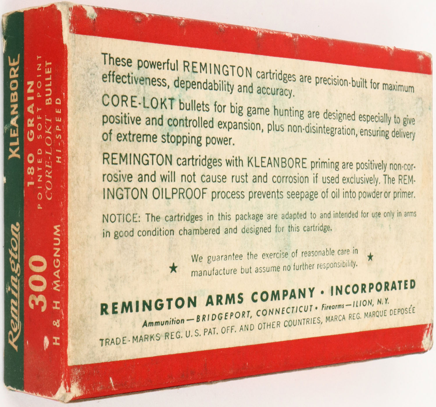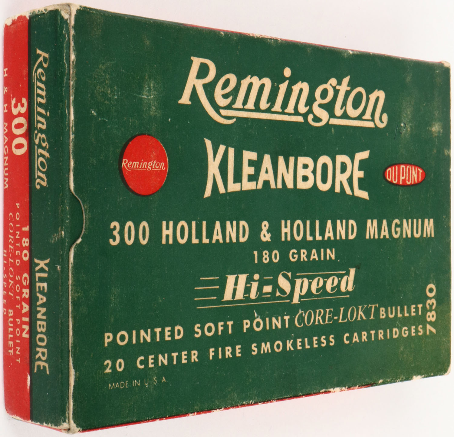 Remington, Kleanbore Hi-Speed, .300 Holland & Holland Magnum, 180 Grain Pointed Soft Point Core-Lokt Bullet, Full, 1pc. Green red & white box, box is solid with excellent color, very minor age soiling & shelf wear, some edge & corner wear, end flaps are solid, ammo is excellent. Grade: Excellent - Value: 40 to 120