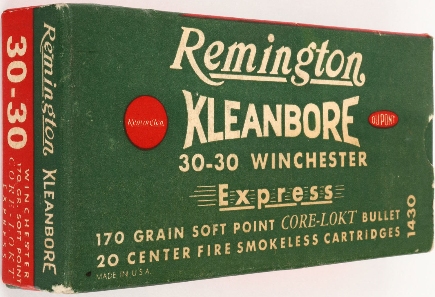 Remington, Kleanbore Express, .30-30 Winchester, 170 Grain Soft Point Core-Lokt Bullet, Full, 1pc. Green red & white box, box is solid with excellent color, very minor age soiling & corner wear, edges are mostly crisp, end flaps are solid, ammo is excellent. Grade: Excellent - Value: 20 to 60