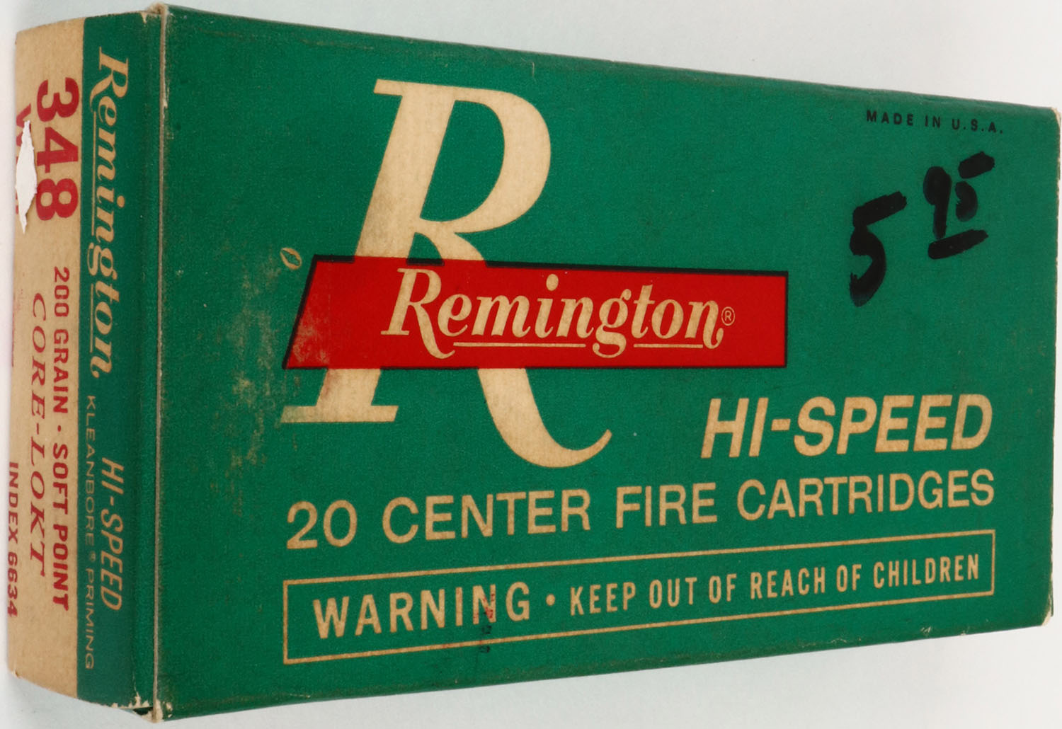 Remington, Hi-Speed, .348 Win., 200 Grain Soft Point Core-Lokt Bullet, Full, 1pc. Green white & red box, box is solid with excellent color, minor age soiling & shelf wear, very minor corner wear, edges are crisp, end flaps are solid, top has been written on, ammo is excellent. Grade: Very Good ++ - Value: 20 to 60