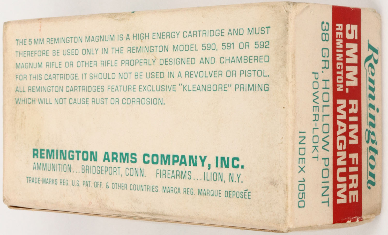Remington, Hi-Speed Rim Fire Magnum, 5mm Remington, 38 Gr. Hollow Point, Power-Lokt, Full, 1pc. White red & green box, box is solid with excellent color, minor age soiling, staining to left end, corner ding on top right corner, minor edge & corner wear, end flaps are solid, ammo is excellent. Grade: Very Good ++ - Value: 20 to 60
