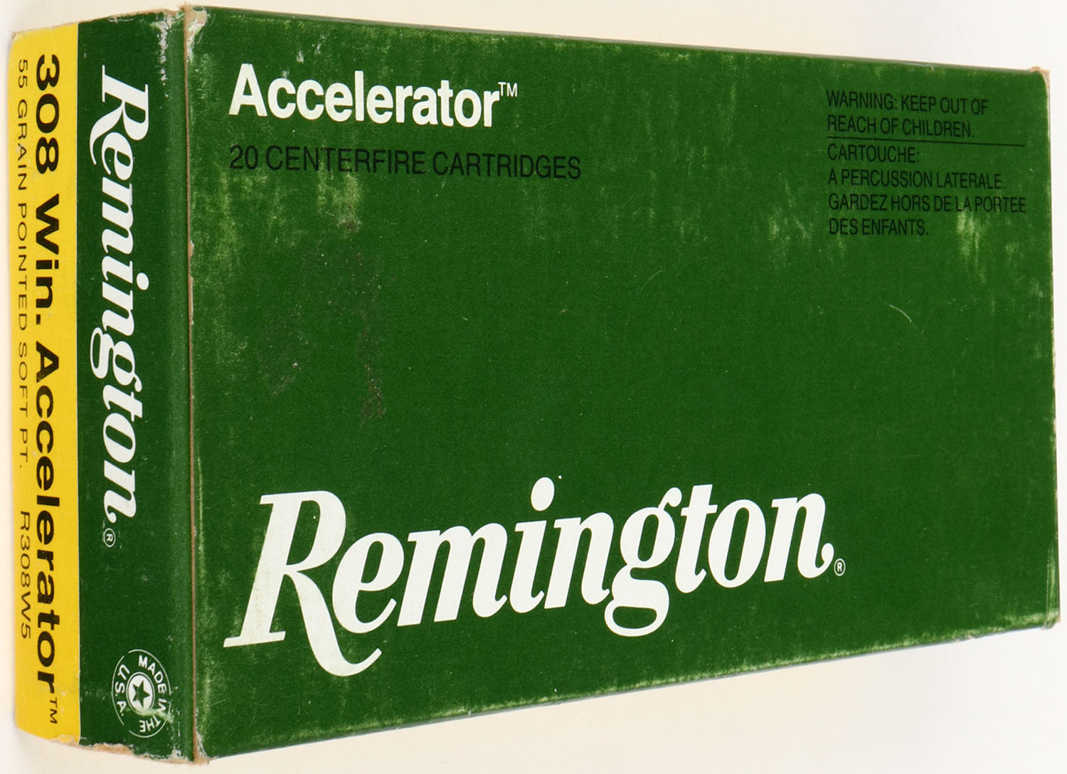 Remington, Accelerator, .308 Win. Accelerator, 55 Grain Pointed Soft Pt., Full, 1pc. Green yellow & white box, box is solid with excellent color, very minor shelf & corner wear, edges are mostly crisp, end flaps are solid, ammo is excellent. Grade: Excellent - Value: 10 to 50
