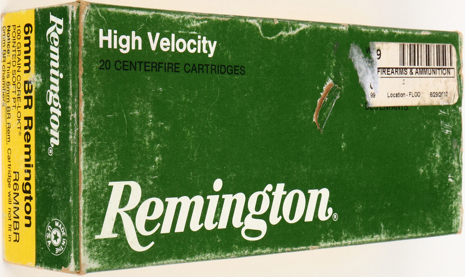 Remington, High Velocity, 6mm BR Remington, 100 Grain Core-Lokt Pointed Soft Pt., Full, 1pc. Green yellow & white box, box is solid with excellent color, shelf wear, some edge & corner wear, end flaps are solid, right end flap has been written on, ammo is excellent. Grade: Very Good ++ - Value: 20 to 60