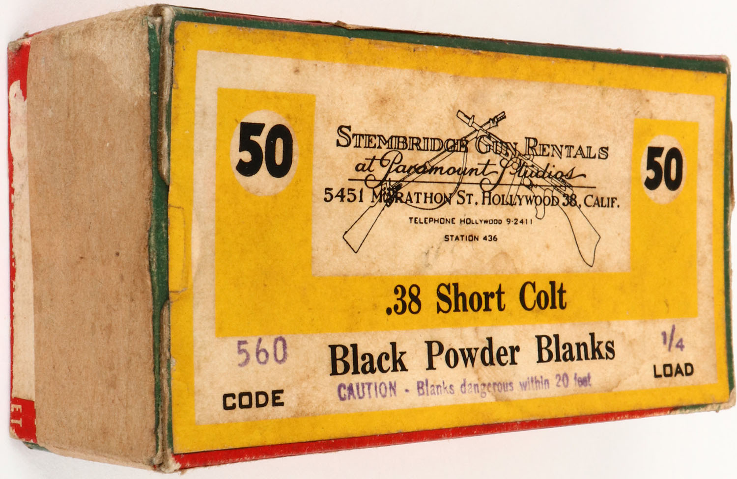 Stembridge Gun Rentals at Paramount Studios, .38 Short Colt, Black Powder Blanks, FULL & SEALED, 1pc. Multicolored box is solid with excellent color, some age soiling & corner wear, edges are mostly crisp, labels are intact. (741) Grade: Very Good + - Value: 20 to 100