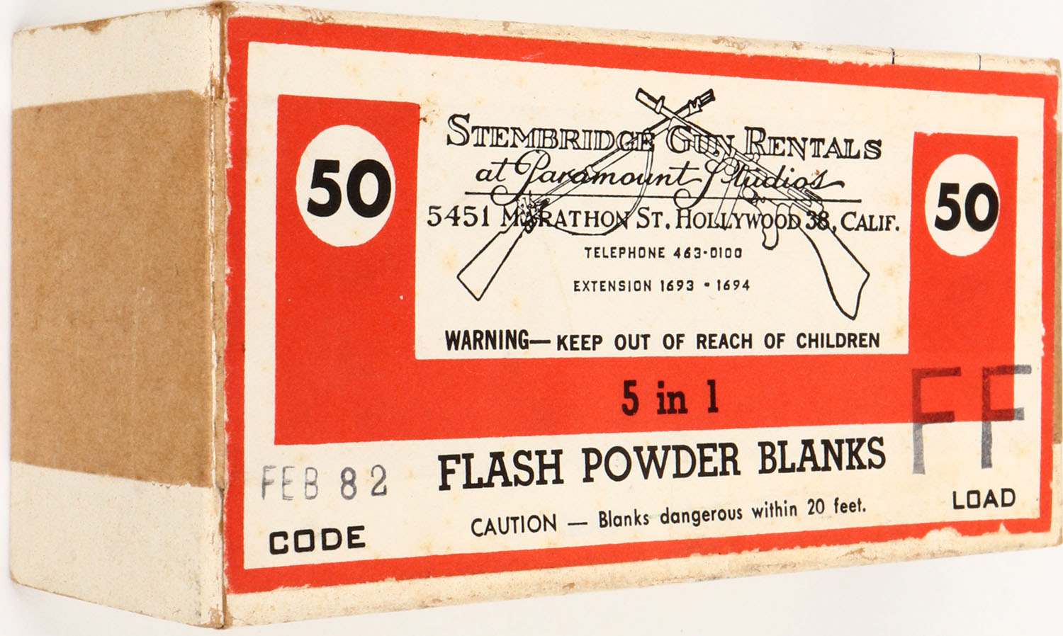 Stembridge Gun Rentals at Paramount Studios, 5 in 1 Flash Powder Blanks, FULL & SEALED, 1pc. White red & black box, box is solid with excellent color, very minor age soiling, very minor edge & corner wear, labels are intact. (880) Grade: Excellent + - Value: 20 to 200