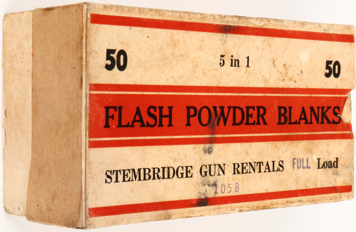 Stembridge Gun Rentals, Full Load, 5 in 1 Flash Powder Blanks, Full, 1pc. White red & black box, box is solid with excellent color, age soiling, very minor corner & edge wear, end flaps are solid, labels are intact, ammo is very good. (745) Grade: Very Good ++ - Value: 20 to 100