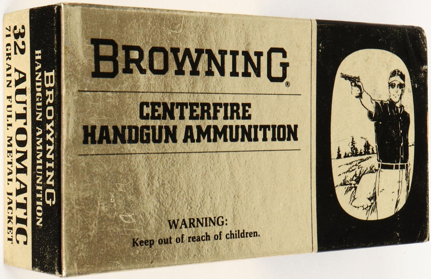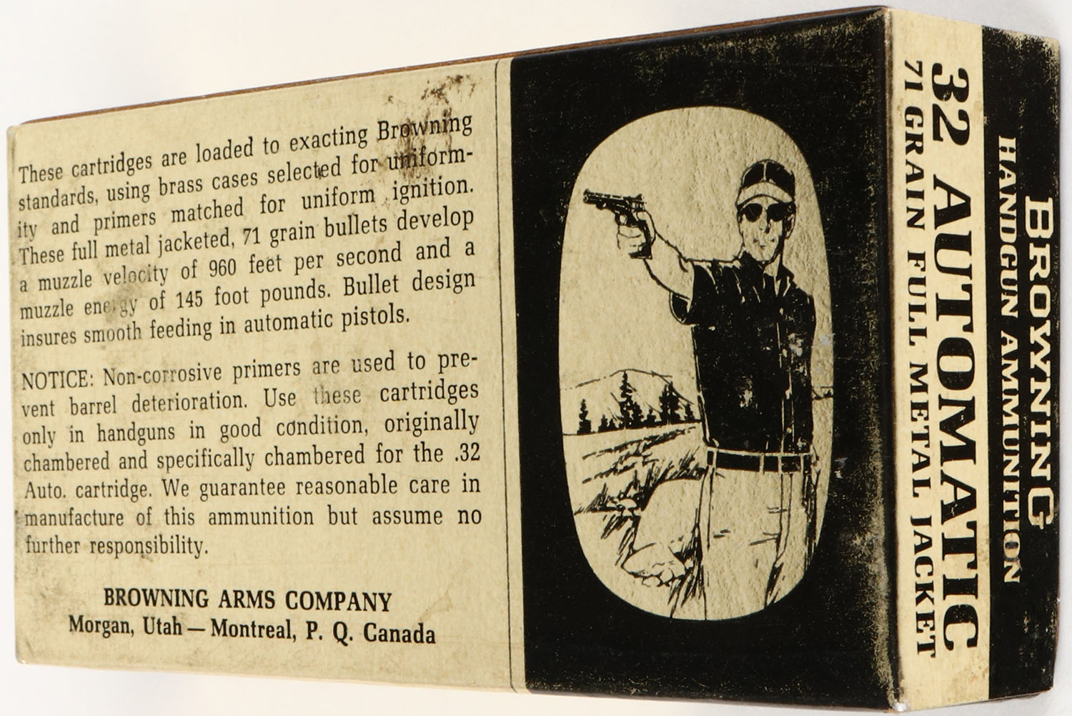 Browning, Handgun Ammunition, .32 Automatic, 71 Grain Full Metal Jacket, Full, 1pc. Gold & black box, box is solid with minty color, very minor shelf & corner wear, edges are mostly crisp, end flaps are solid, ammo is excellent to minty. Grade: Excellent + - Value: 10 to 50