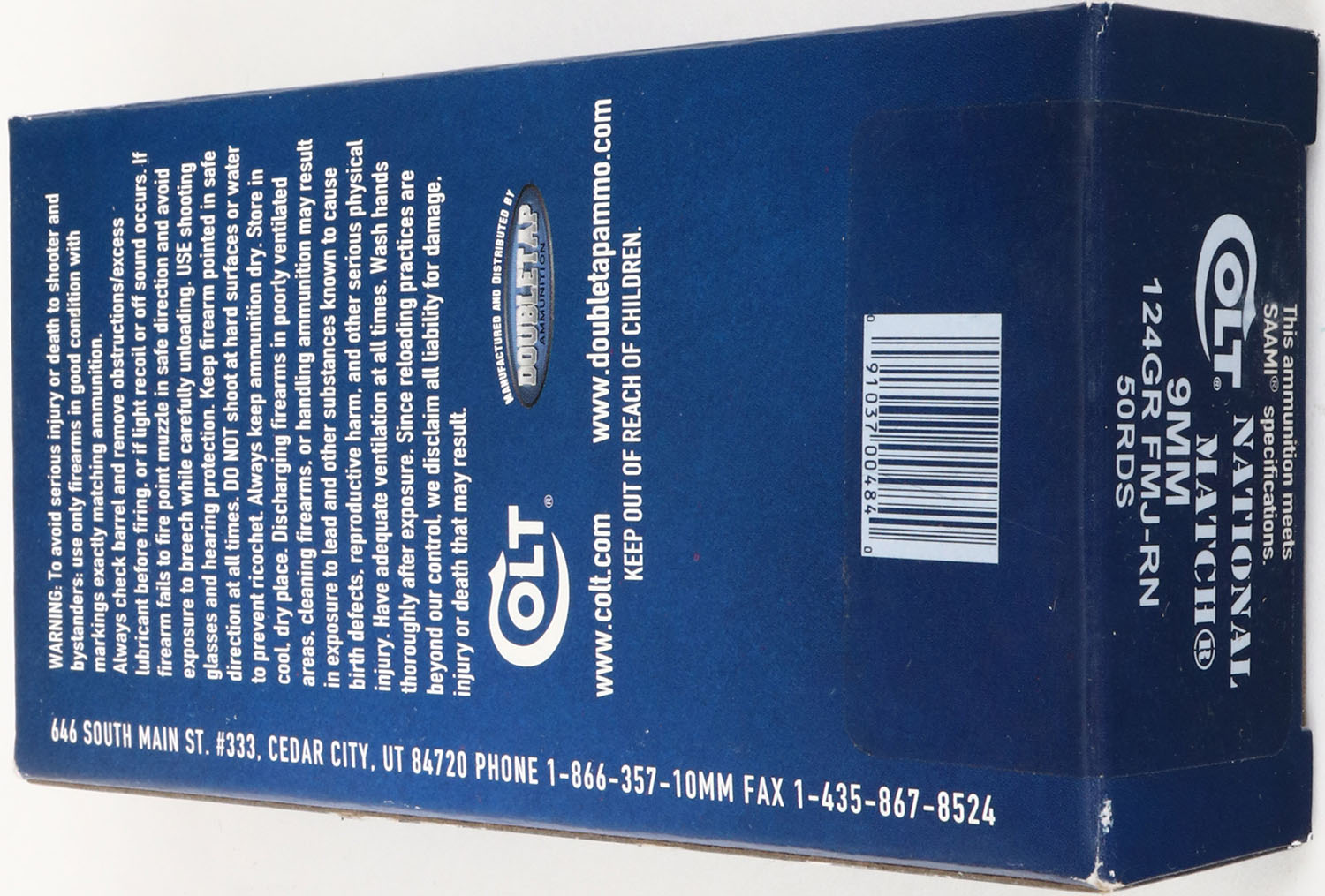 DoubleTap, 9mm, 124 Grain FMJ-RN, Colt National Match, 1pc, Full, blue box with white print, box is solid with excellent color, light rub marks, edges are crisp, end flaps are solid, ammo is excellent. Grade: Excellent + - Value: 20 to 60