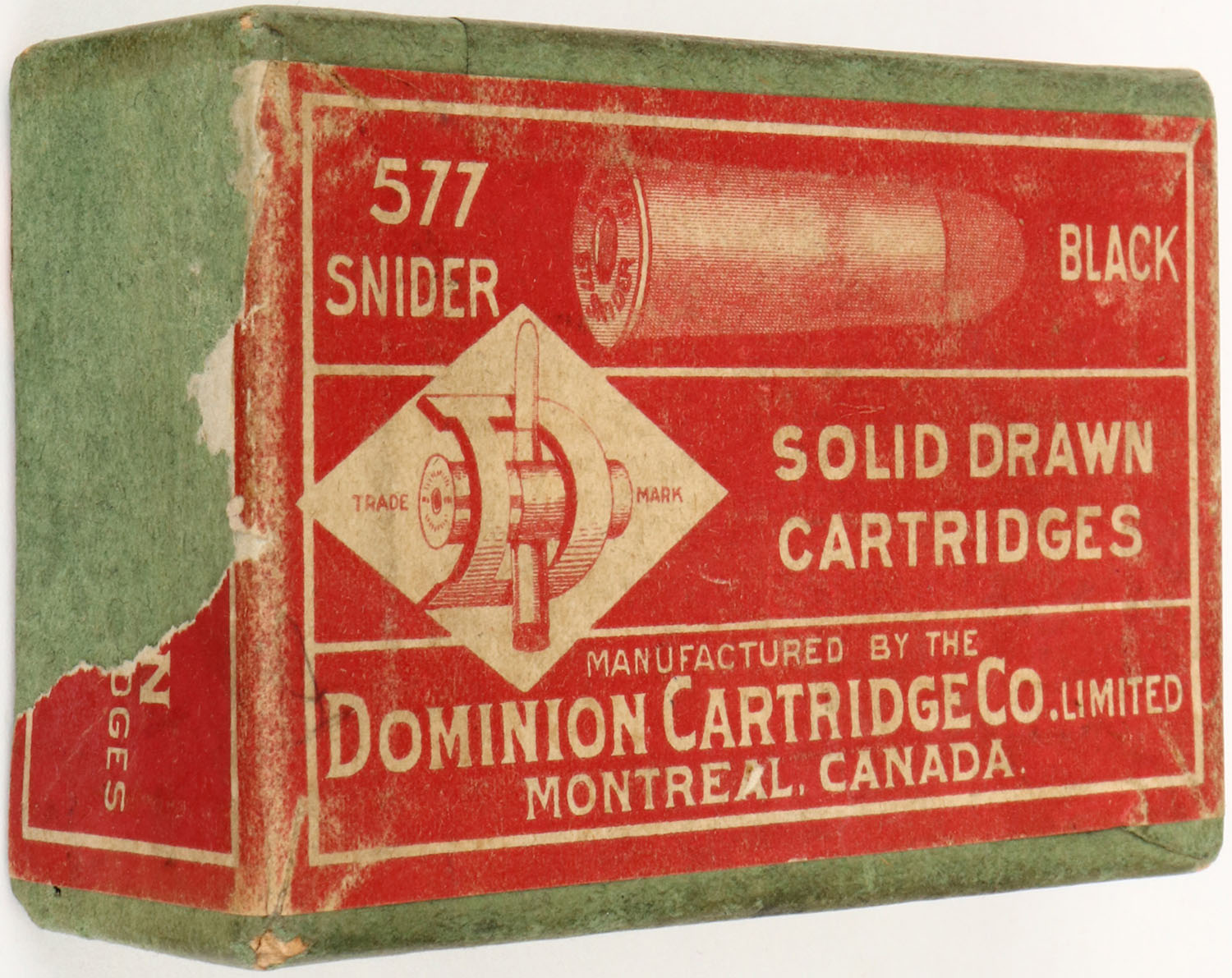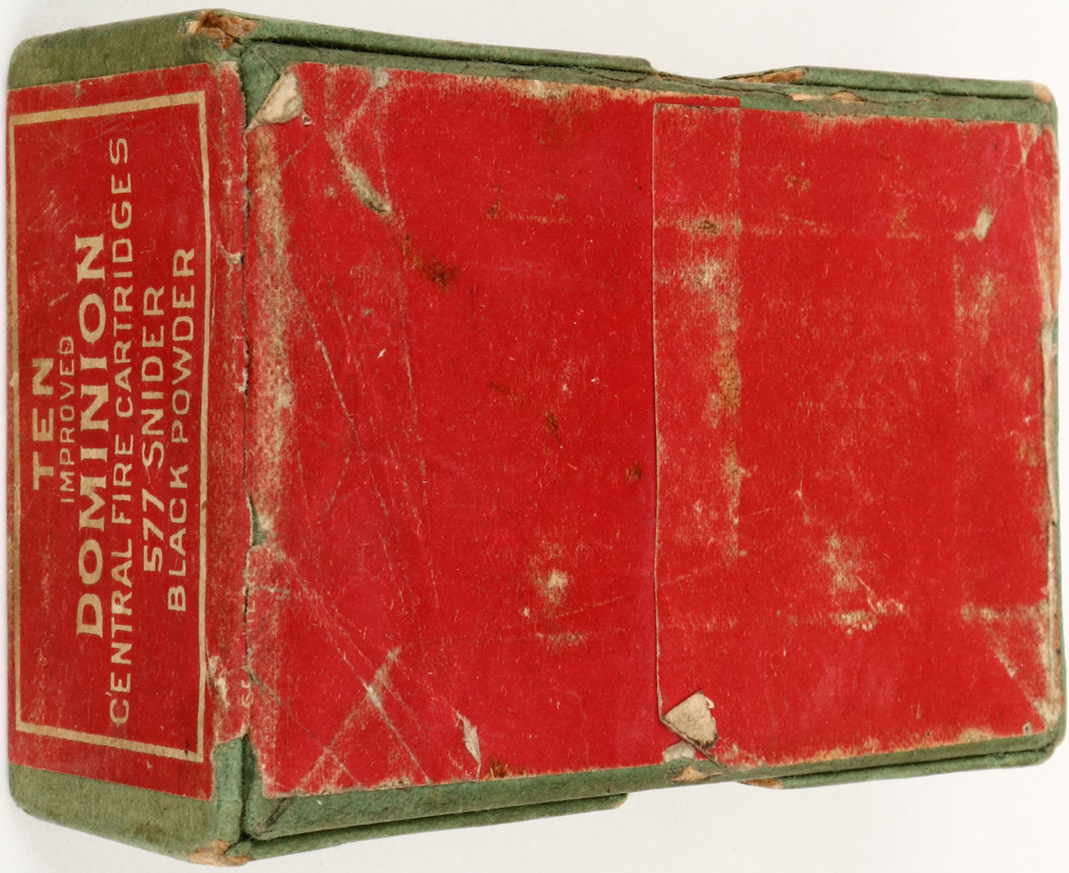 CIL, .577 Snider, Black powder, 2pc, Empty, green box with red label & white print, box is solid with rub marks, edge wear & corner wear. Grade: Very Good + - Value: 10 to 100