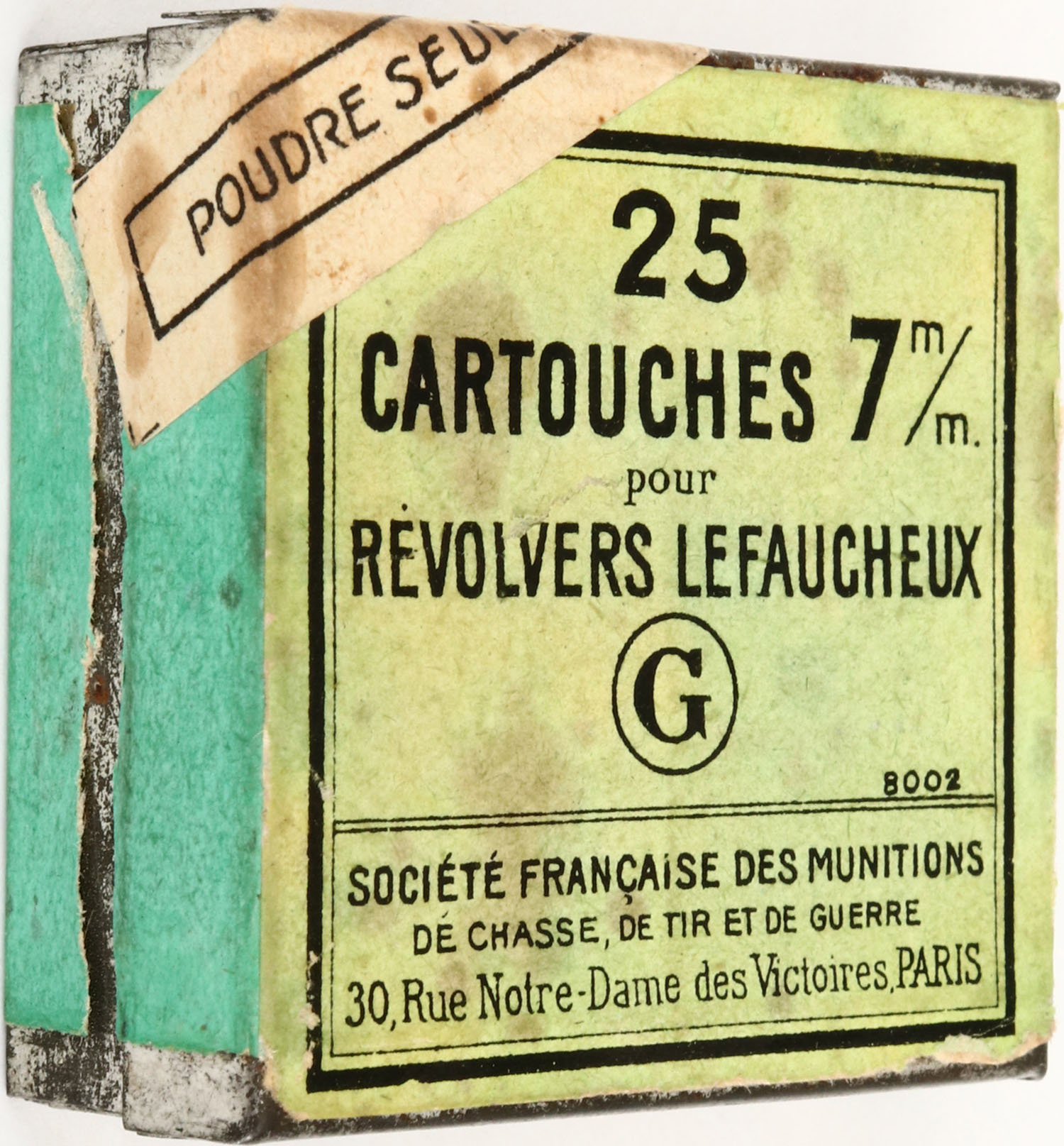 Societe Francaise Des Munitions, 7mm Pinfire Blanks, 2pc, Full, Metal box with green label & black print, box is solid with very good color, light age soiling/stains, light rub marks & light edge wear, ammo is very good. (1030) Grade: Excellent - Value: 10 to 30