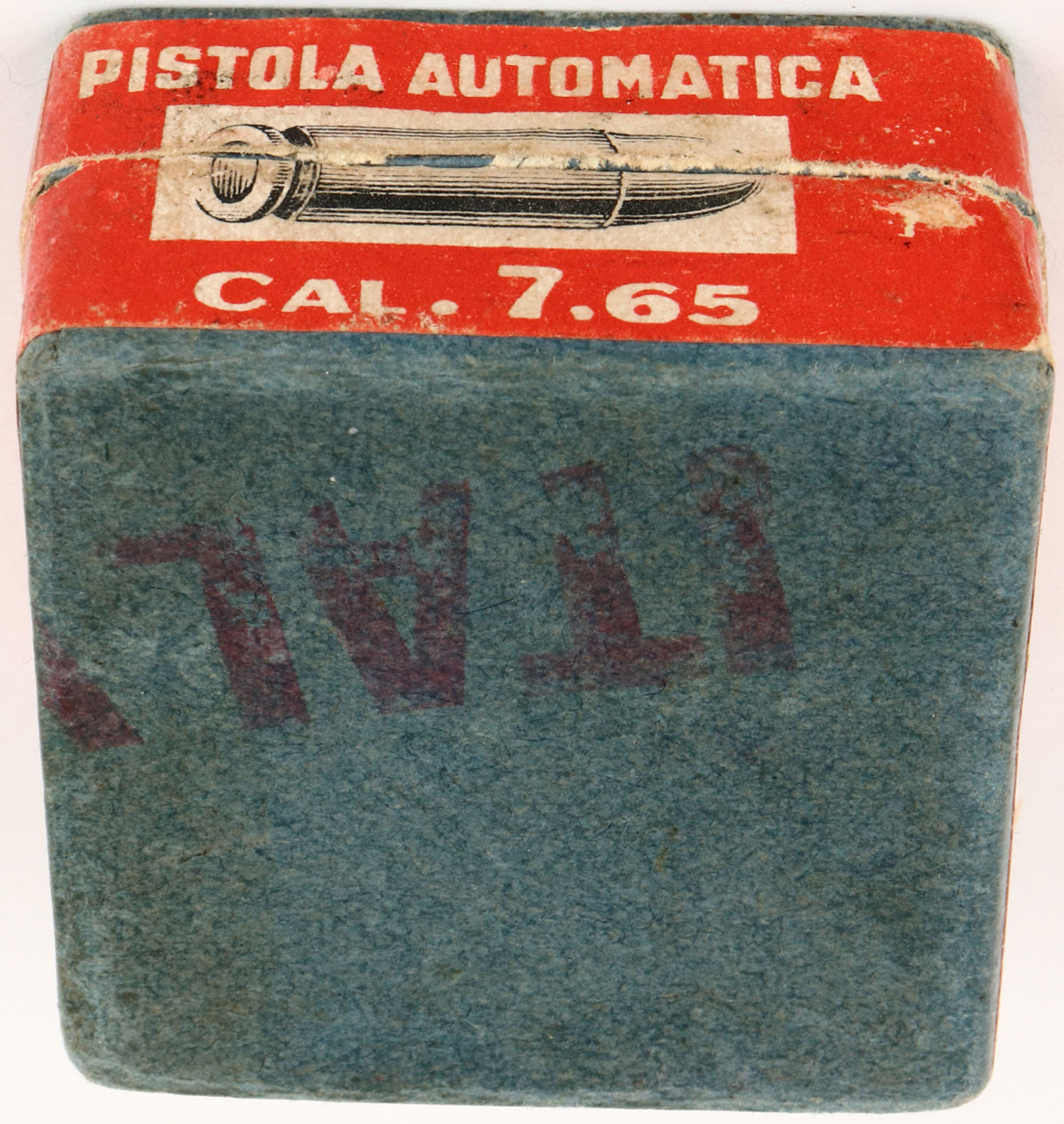 Societa Italiana Munizoni, 7.65 Pistole Automatiche, 2pc, Full, Blue box with red label & white print, box is solid with pencil marks, rub marks, very good box color & crisp edges, ammo is very good. (1275) Grade: Very Good ++ - Value: 10 to 100