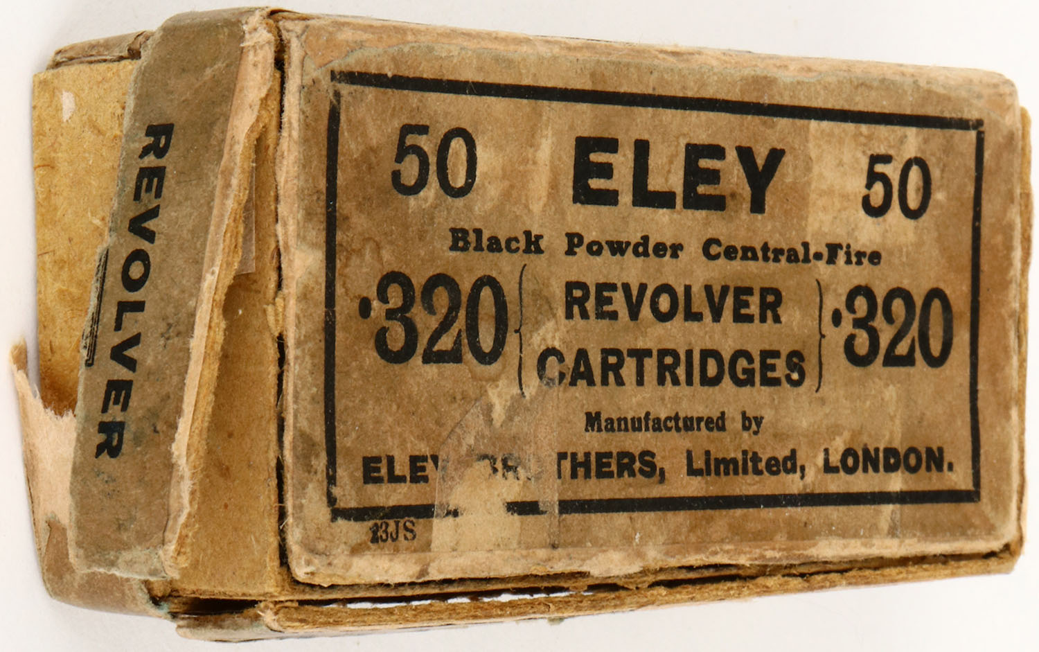 ELEY, .32, Black Powder, 2pc, Full, buff box & label with black print, box is falling apart with multiple seam tears, pieces of box missing & detached, age soiling, rubbing marks & edge wear, ammo is good. (1399) Grade: Good + - Value: 20 to 60