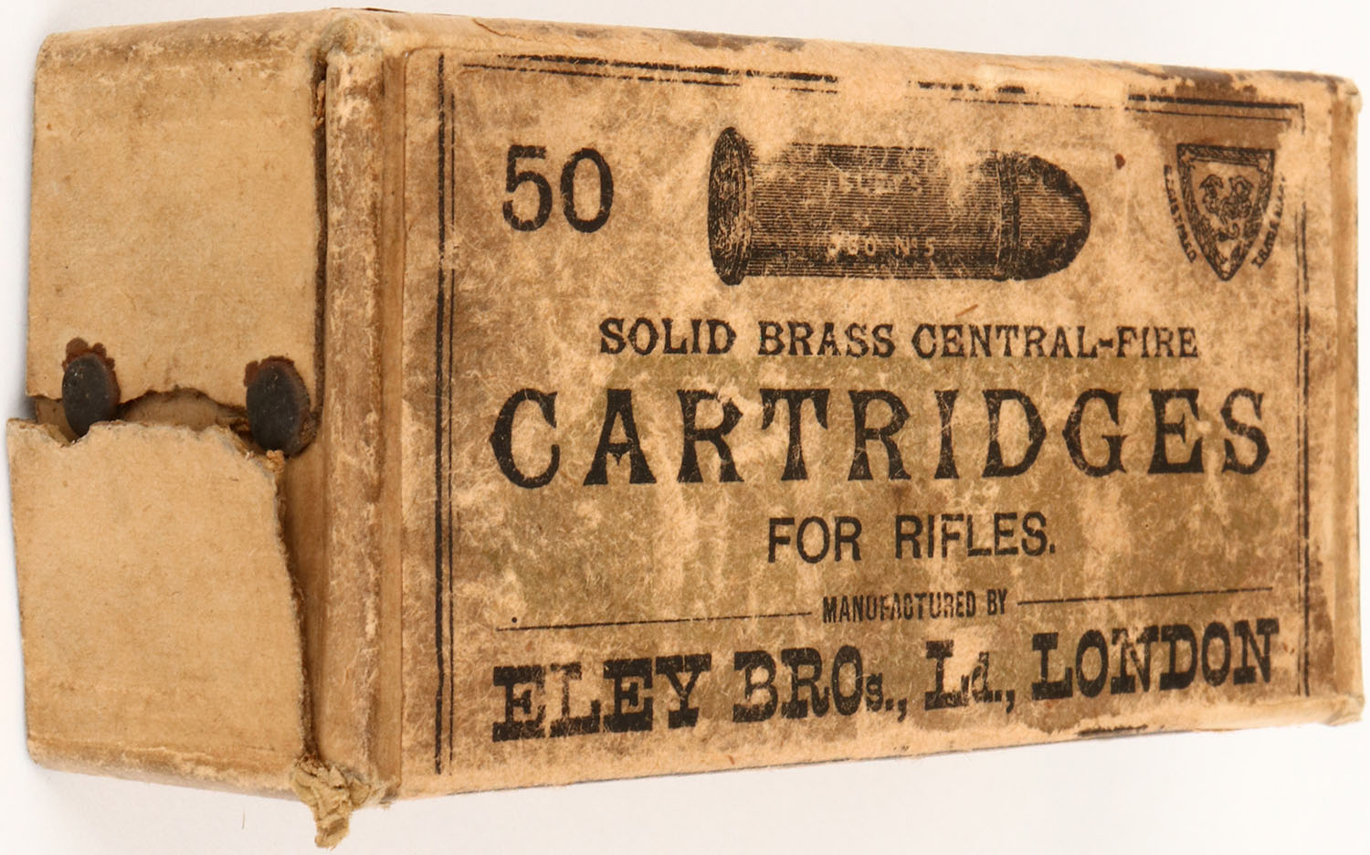 ELEY, .360 No 5, 134 Gr. Bullet, 2pc, Partial 48 Rds., buff box & label with black print, box is solid with rub marks, edge wear & corner wear, ammo is very good. (1552) Grade: Very Good ++ - Value: 20 to 100