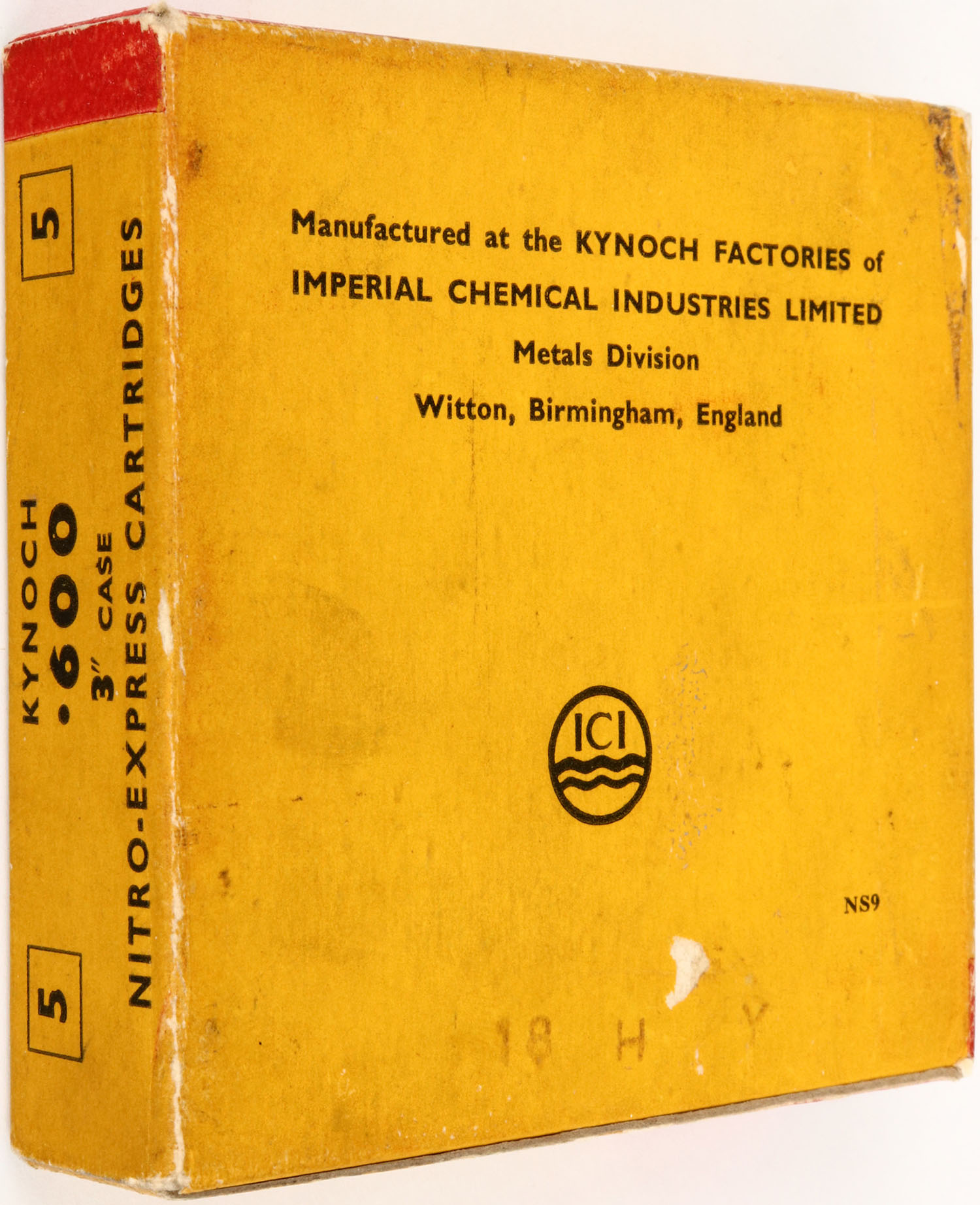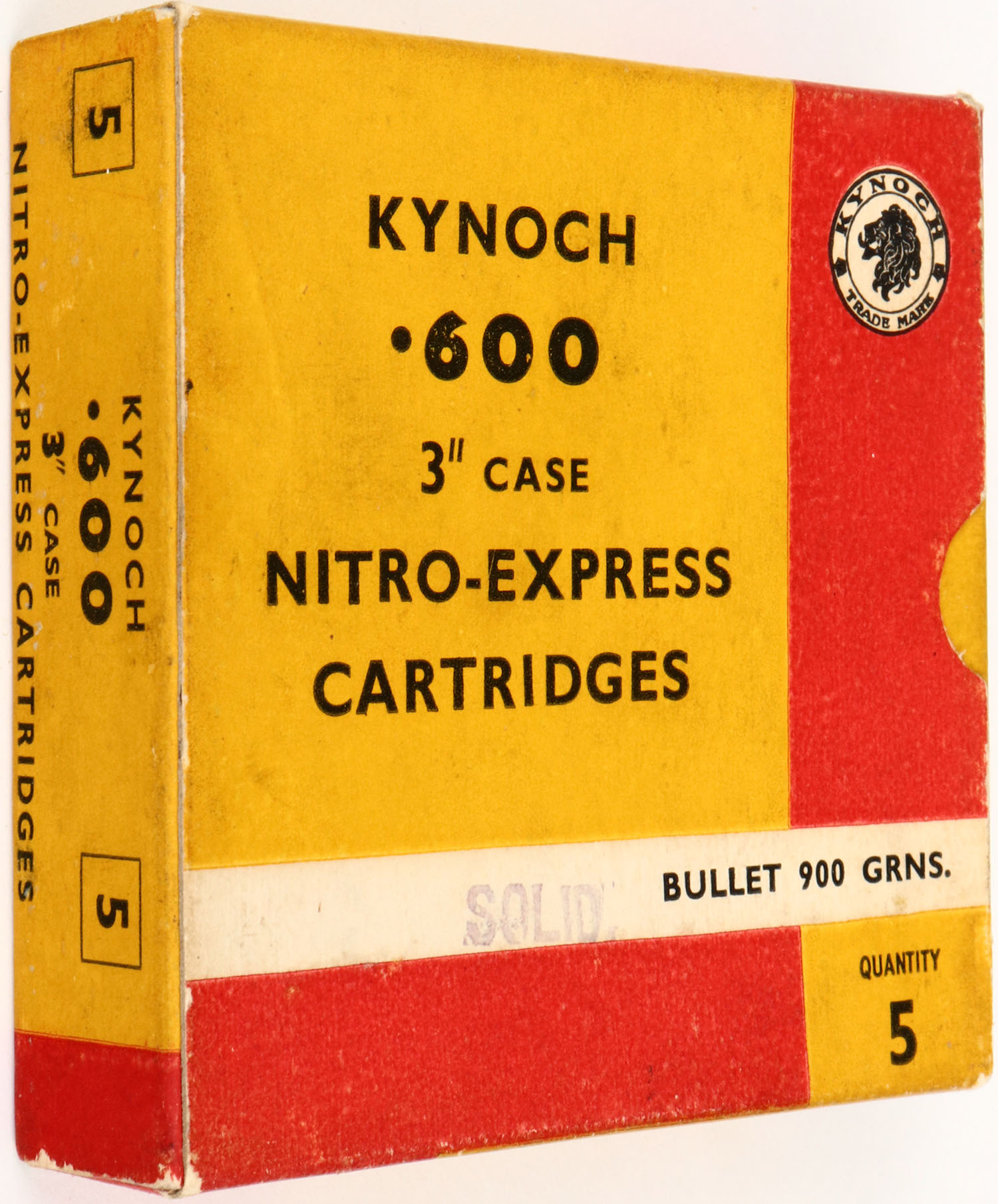 Kynoch, .600 Nitro-Express, 900 Grs. Bullet, 1pc, Full, yellow/red/white box with black print, box is solid with very good color, rub marks, light edge wear & light corner wear, ammo is very good. (696) Grade: Excellent - Value: 100 to 300