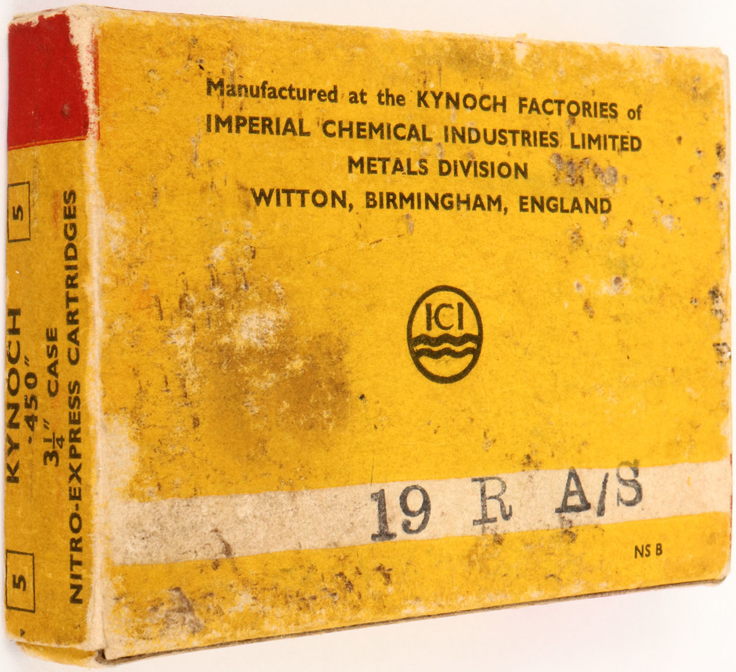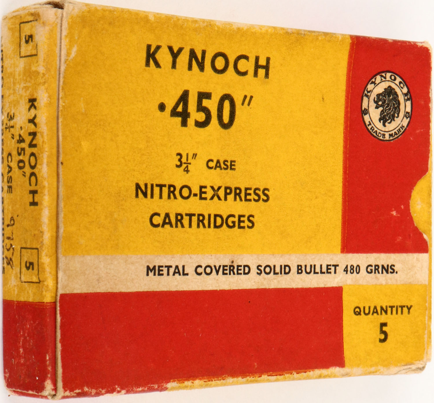 Kynoch, .450 Nitro-Express, 480 Grs. Bullet, 1pc, Full, yellow/red/white box with black print, box is solid with light age soiling, rub marks, light edge wear & light corner wear, ammo is good. (6670) Grade: Excellent - Value: 20 to 100