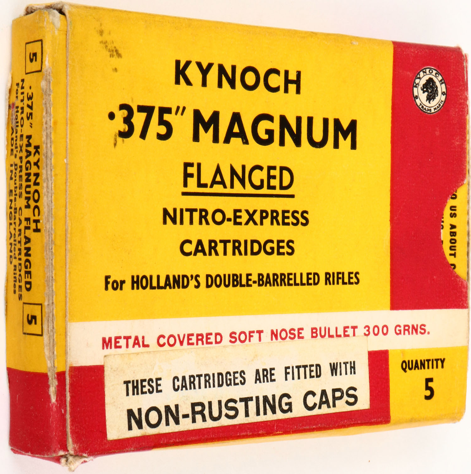 Kynoch, .375 Flanged Nitro-Express, 300 Grs. Bullet, 1pc, Full, yellow/red/white box with black print, box is solid with very good color, rub marks, light edge wear & light corner wear, ammo is very good. Grade: Excellent - Value: 30 to 120