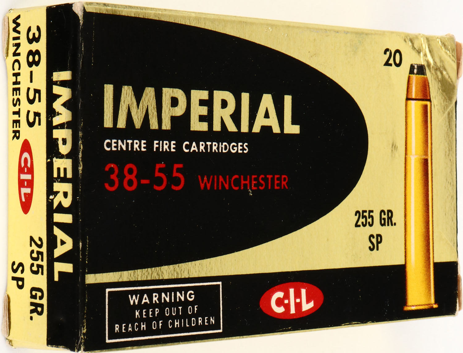 CIL, 38-55 Winchester, 255 Gr. SP Bullet, 1pc, Full, gold box with black print & white/red print, box is solid with excellent color, handling wear, light rub marks & light edge wear, ammo is excellent. Grade: Excellent - Value: 40 to 80