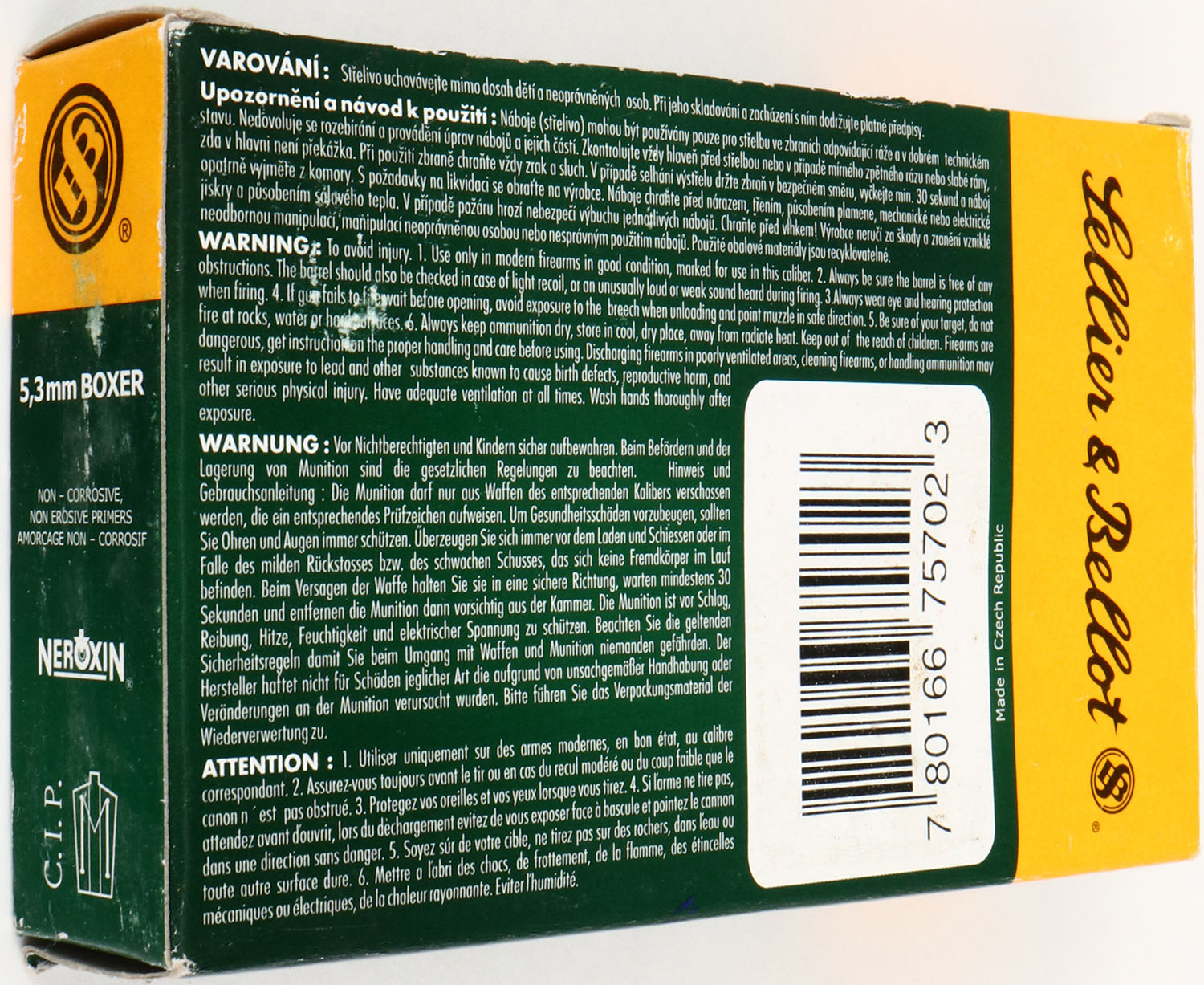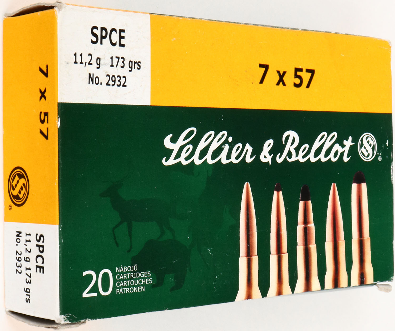 Sellier & Bellot, 7x57mm, 173 Grs. SPCE Bullet, 1pc, Full, green/yellow/white box with black print, box is solid with excellent color, light rub marks, light edge wear & light corner wear, ammo is excellent. Grade: Excellent - Value: 20 to 40