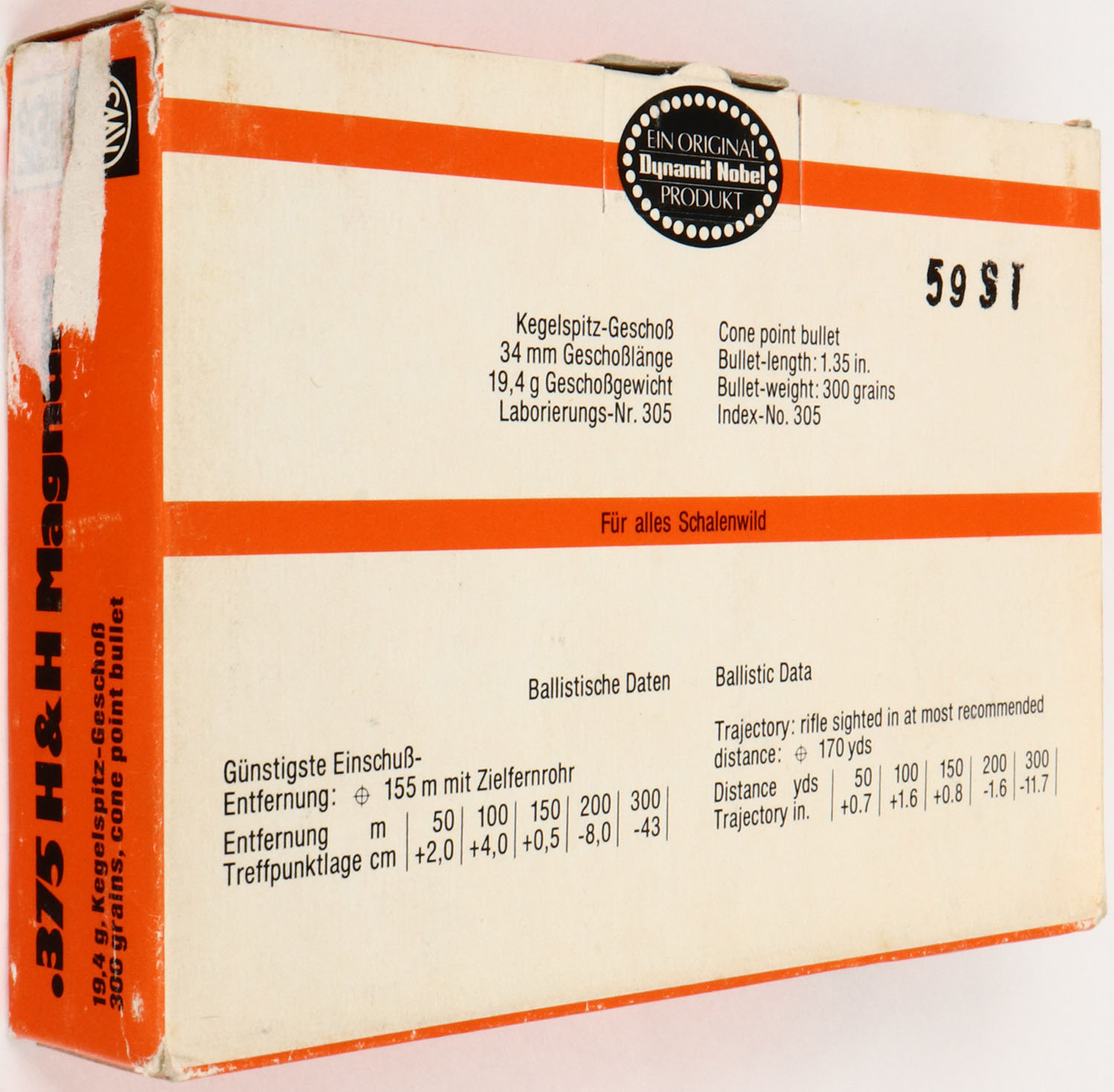 SINOXID, .375 H&H Mag., 1pc, Full, white/orange box with black print, box is solid with sticker on end, sticker mark on other end, light rub marks & light edge wear, ammo is excellent. Grade: Excellent + - Value: 30 to 90