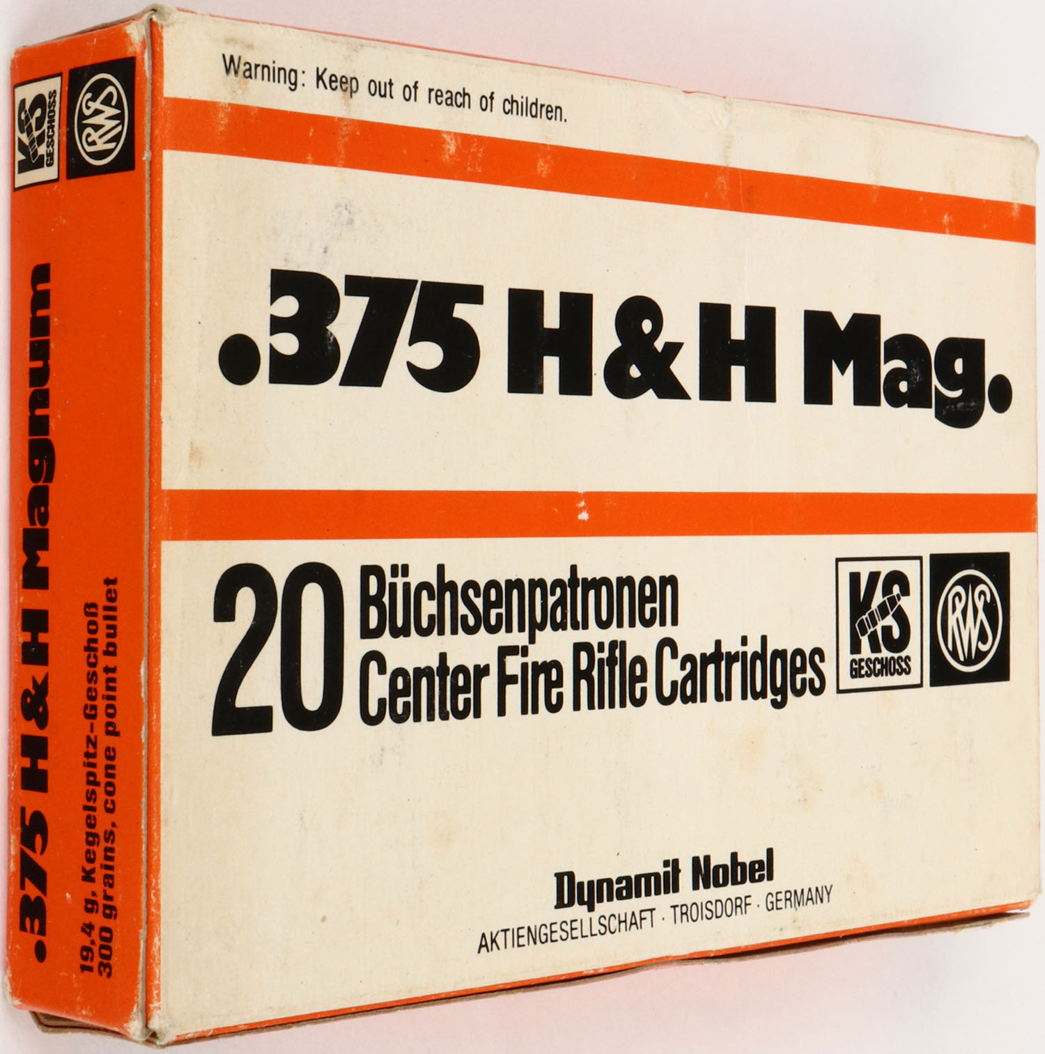 SINOXID, .375 H&H Mag., 1pc, Full, white/orange box with black print, box is solid with sticker & sticker mark on end, light rub marks & light edge wear, ammo is excellent. Grade: Excellent + - Value: 30 to 90