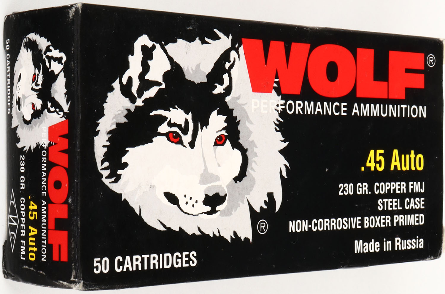 Wolf, .45 Auto, 230 Gr. Copper FMJ, Steel Case, 1pc, Full, black box with white/red/yellow print, box is solid with light wear, ammo is MINT. Grade: Excellent + - Value: 20 to 60