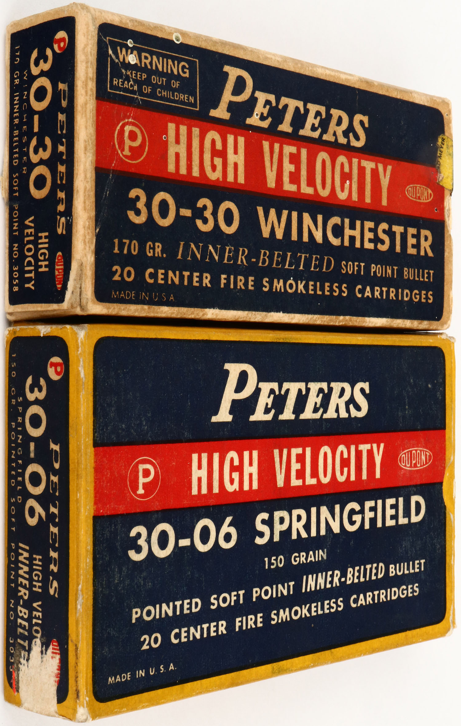 Peters, Lot of (2), High Velocity, (1) .30-30 Winchester, 170 Gr., box is solid with age soiling, ammo is excellent, (1) .30-06 Springfield, 150 Gr., box is solid with minor age soiling, ammo is excellent. Grade: Excellent + - Value: 30 to 90