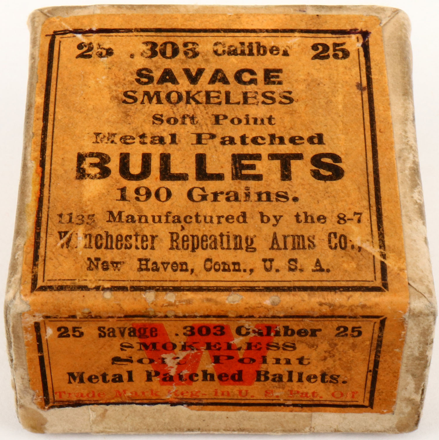 Winchester, .303 Caliber Savage, Smokeless, 190 Grain Soft Point Bullets, FULL & SEALED, 2pc. Buff box with orange & black label, box is solid with excellent color, some age soiling, very minor edge & corner wear, labels are intact. Grade: Excellent ++ - Value: 20 to 80