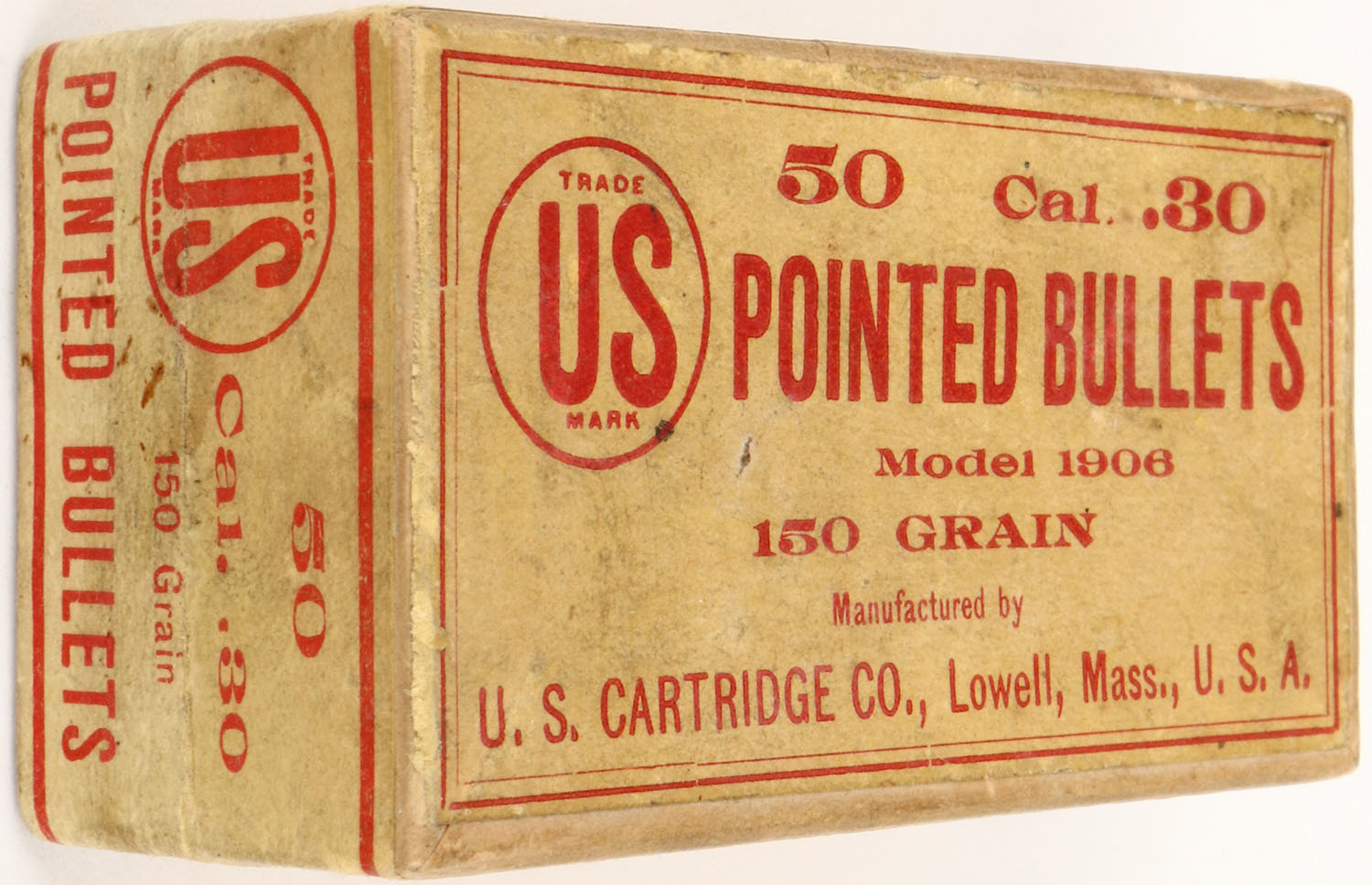 U.S. Cart. Co., Cal. .30, 150 Grain Pointed Bullets, FULL & SEALED, 2pc. Buff box with buff & red top & side sealing labels, box is solid with very good color, some age soiling, very minor edge & corner wear, labels are intact. Grade: Excellent ++ - Value: 20 to 100