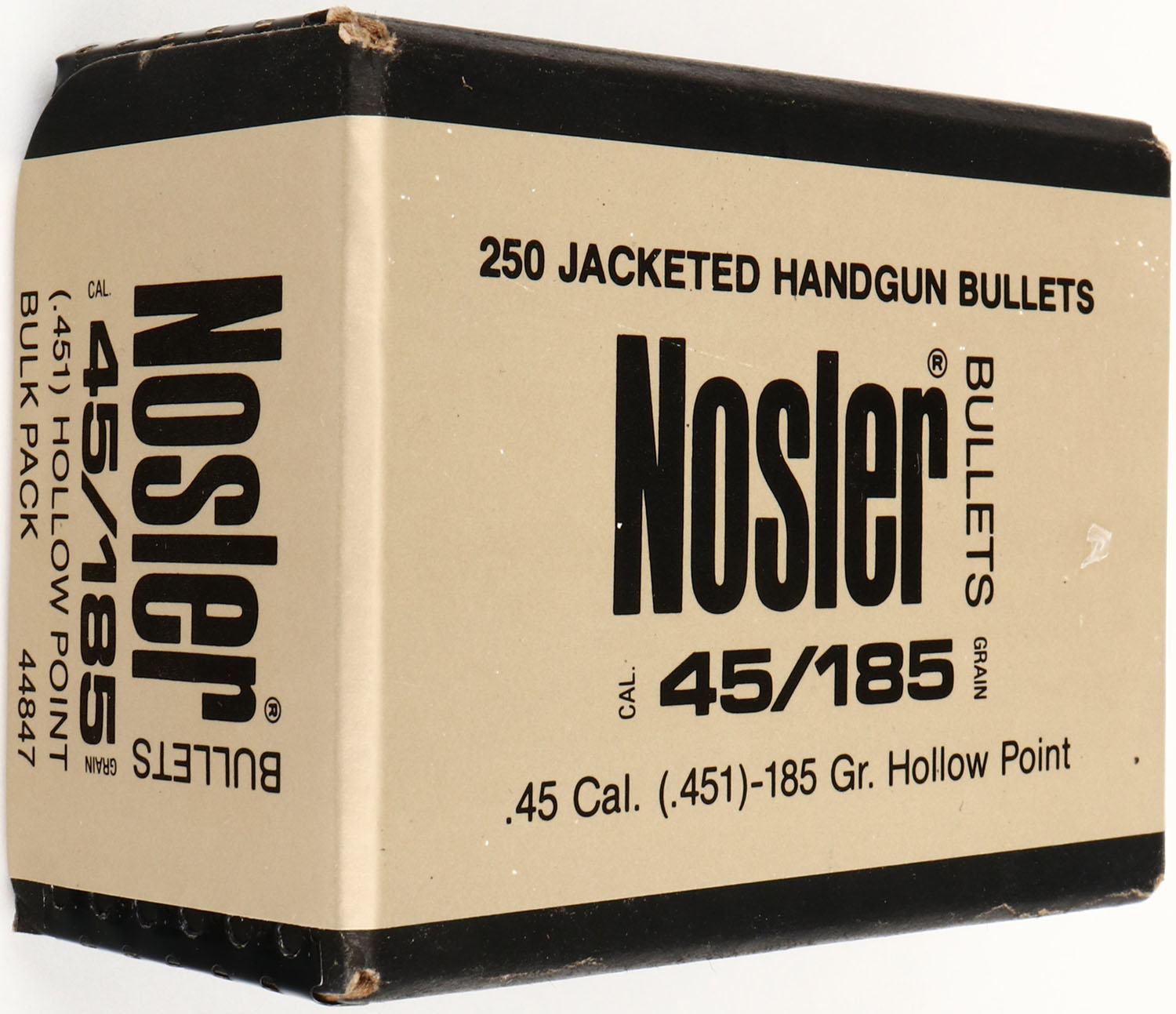 Nosler, 45/185, .45 Cal. (.451), 185 Gr. Hollow Point Bullets, FULL & SEALED, 1pc. Black box with gold & black label, box is MINT with mint color. Grade: MINT - Value: 30 to 120