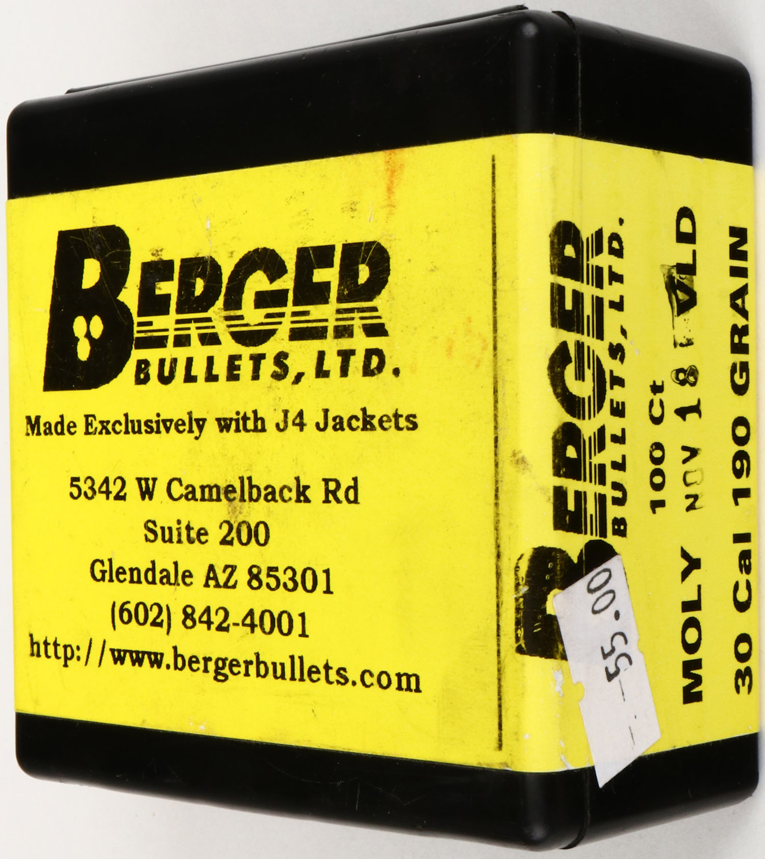 Berger, .30 Cal., 190 Grain Moly, VLD, FULL & SEALED, 100rds., 1pc. Black box with yellow label, box is solid, label is excellent. Grade: Excellent ++ - Value: 20 to 100