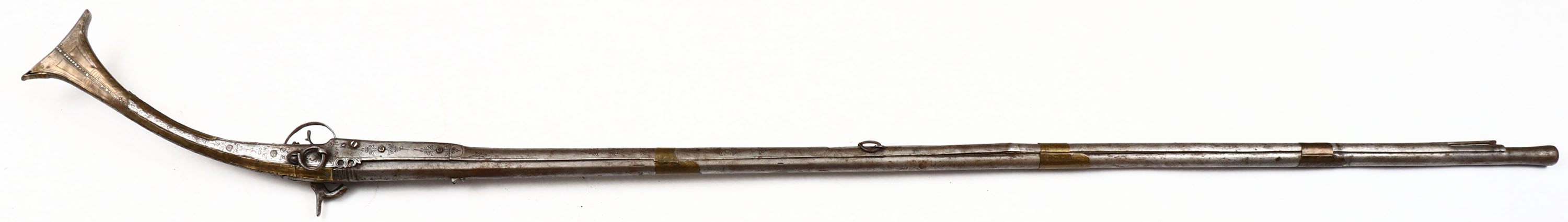 Afghan, Jezail, CAL: .67. MFG: Unknown, S/N: N/A, Percussion Muzzleloader, 52'' round barrel. The metal stock is very good with ornamental engraving & brass plating that is pealing up in spots, has rust speckling & patina. The metal is worn to a gun metal gray & has rust speckling, thin brass barrel bands with engraving. Bore is poor with rust & pitting. No front sight, U-notch rear sight. Side mounted sling rings, comes with ramrod. Missing percussion nipple. These Jezail rifles were all handmade & come in many shapes & sizes. Antique, No FFL Req. - Value: 200 to 1000